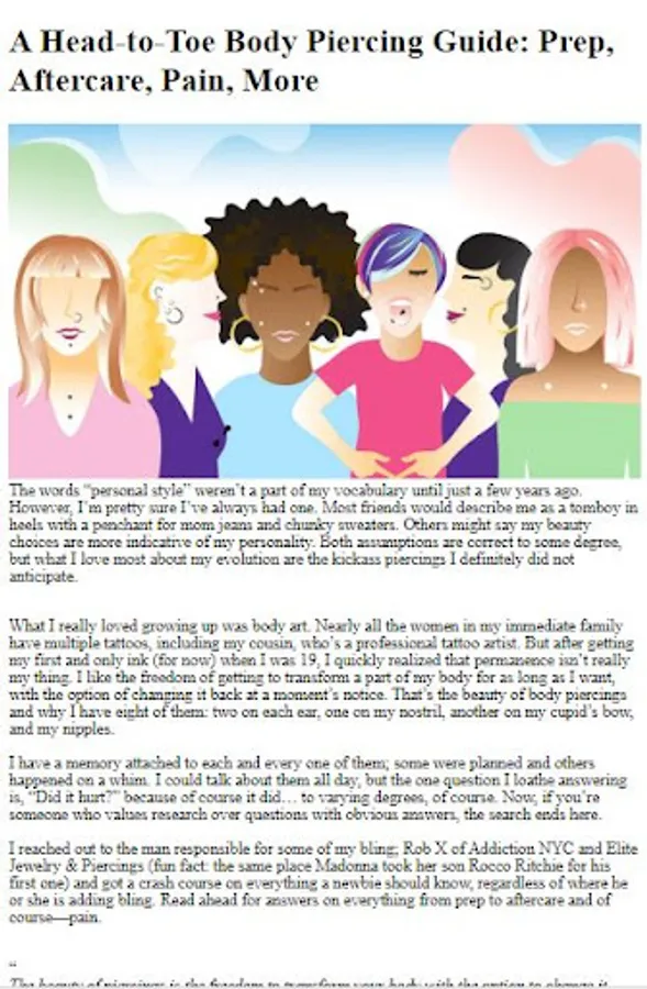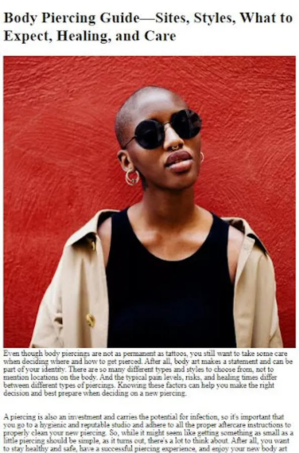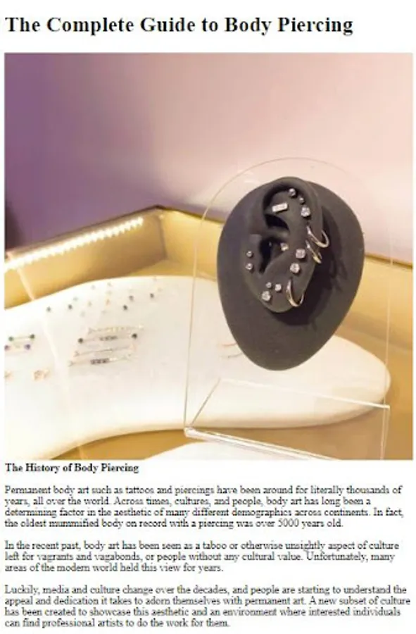 Delve into the artistry behind body piercings and jewelry selection with our app's informative guides. Learn about different piercing techniques, materials, and styles to make informed decisions that align with your personal taste and comfort. Say goodbye to confusion and hello to a well-rounded understanding of the art of body piercing.