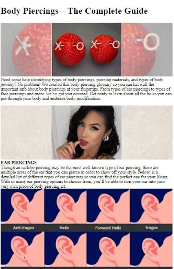 Dive into our app's comprehensive collection of piercing options, ranging from ear piercings to facial piercings, body piercings, and beyond. Explore different styles, placements, and jewelry choices to find the perfect piercing that reflects your individuality. Say goodbye to boring piercings and hello to a world of possibilities.