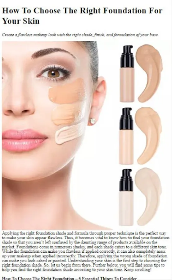 Unlock the secret to achieving a flawless complexion with the ultimate app, Find the Right Foundation for Your Skin. Say goodbye to guesswork and embrace a world of expert advice, personalized recommendations, and a wealth of knowledge to help you discover the perfect foundation match for your unique skin type. Get ready to enhance your natural beauty and rock a complexion that radiates confidence.