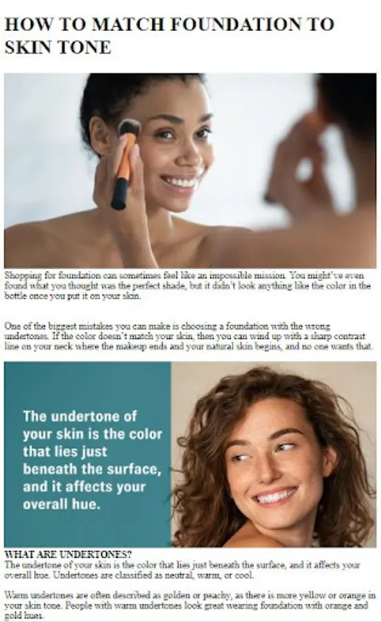 Benefit from the expertise of professional makeup artists who share their insider tips and tricks for achieving a seamless foundation application. From choosing the right formula for your skin type to mastering the art of blending, our app provides you with the knowledge and skills to achieve flawless coverage. Say goodbye to cakey or mismatched foundation and hello to a natural-looking, radiant complexion.
