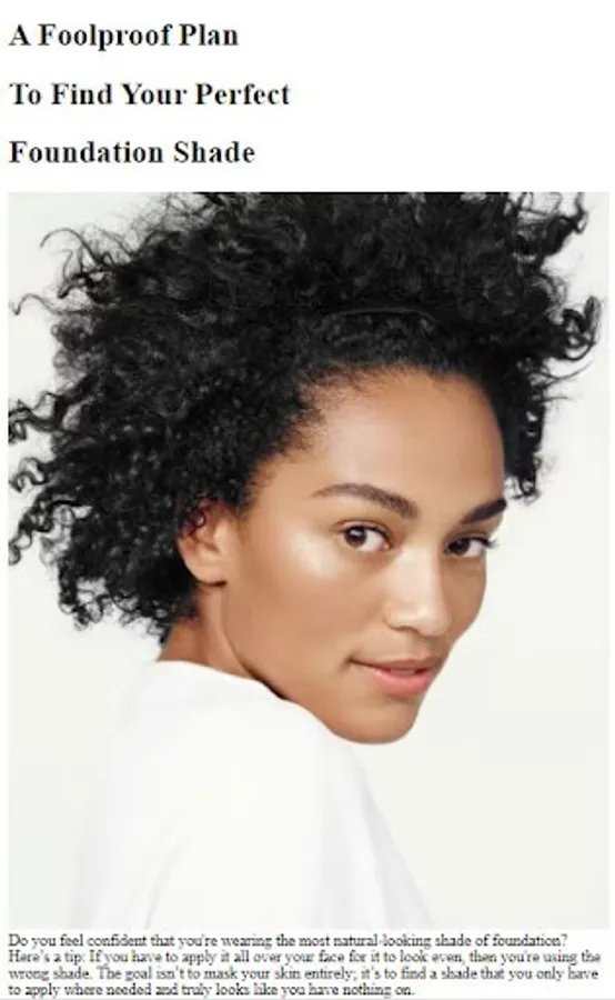 Finding the right foundation can be overwhelming, but fear not! Our app simplifies the process by guiding you through a series of questions tailored to your skin type, tone, and desired coverage. Our advanced algorithm analyzes your responses and provides personalized recommendations for your perfect foundation match. Say hello to a flawless complexion that looks and feels like your skin, only better.
