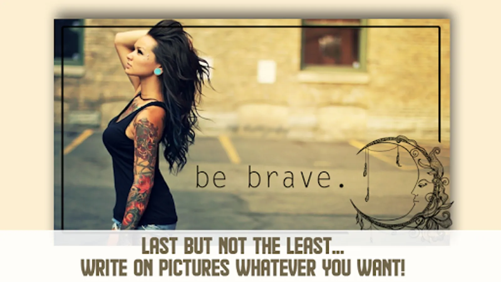 đˇ If you're thinking about tattooing yourself but you're not ready yet to commit to it, using our âtattoo filterâ might do a trick. All you have to do is download ⍠Beauty Tattoo App to Write on Photos ⍠and select one of your cutest pictures. When you're done scrolling through your phone gallery, you can start scrolling through our âtattoos picturesâ. We did our best to create the most original âcool tattoosâ gallery! This way you can experience everything but the pain. The only thing you should be scared of is not using âphoto editing appâ to its full potential. In case you were wondering how would short tattoo quotes look on your ankle, you can simply âadd text to imageâ. Take your time. First tattoo is always the hardest one to get. Until you have no doubt about what you're getting, try out different ideas with our âtattoo editorâ! đˇ