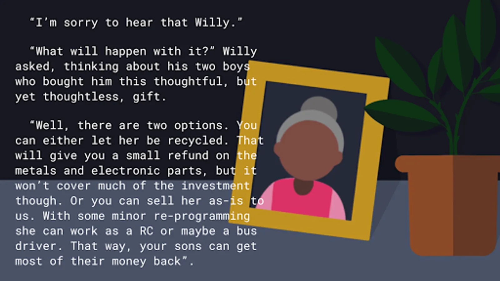 This is a story about loss, loneliness and robots, in a not too distant future. But most of all, this is a story about how far we are willing to go to fill the empty space of someone we have loved and lost, and how our choices effects the future.