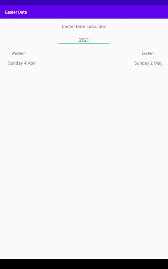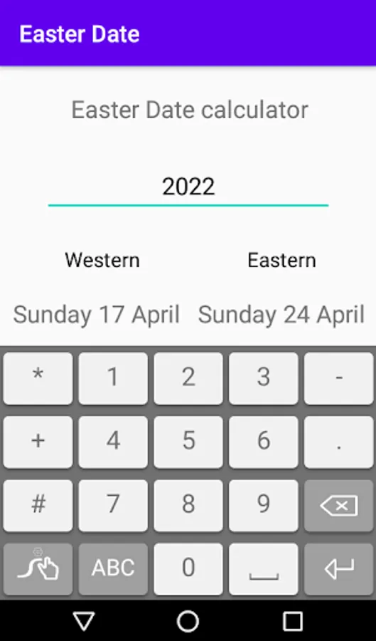 Easter Date calculator is an intuitive app, it tells when the religious holiday will fall for both Western (Catholic and Evangelical) and Eastern Orthodox calendars.