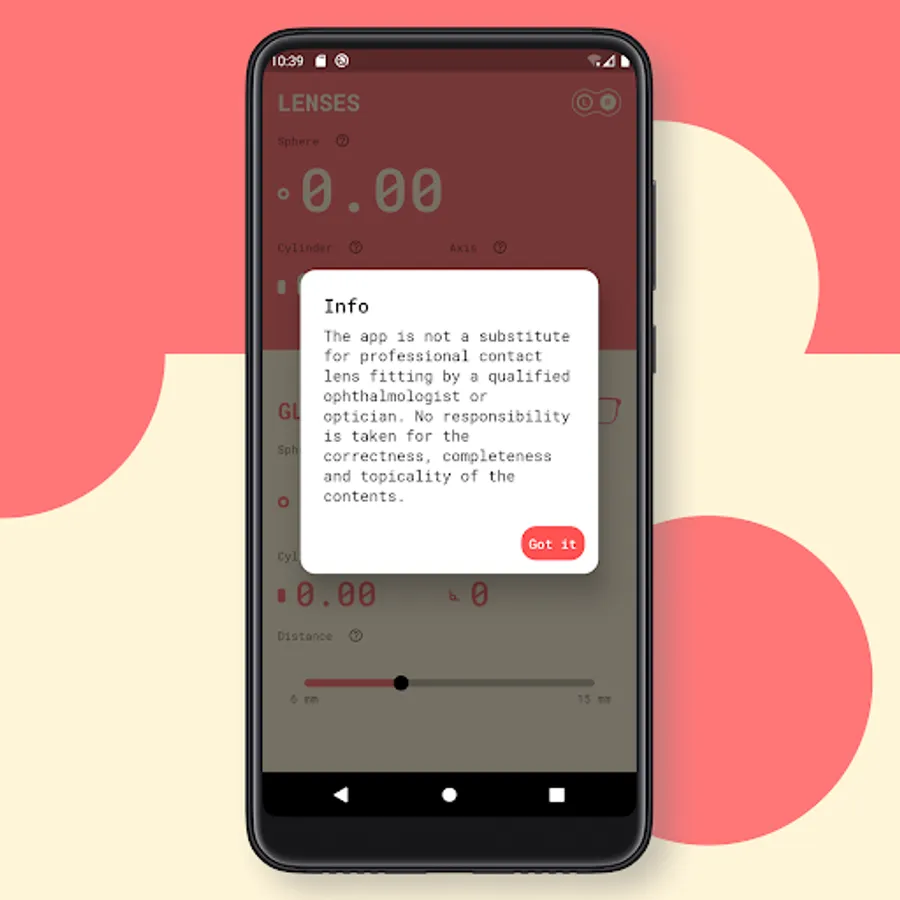The app is not a replacement for a professional contact lens fitting by a qualified ophthalmologist or optician!