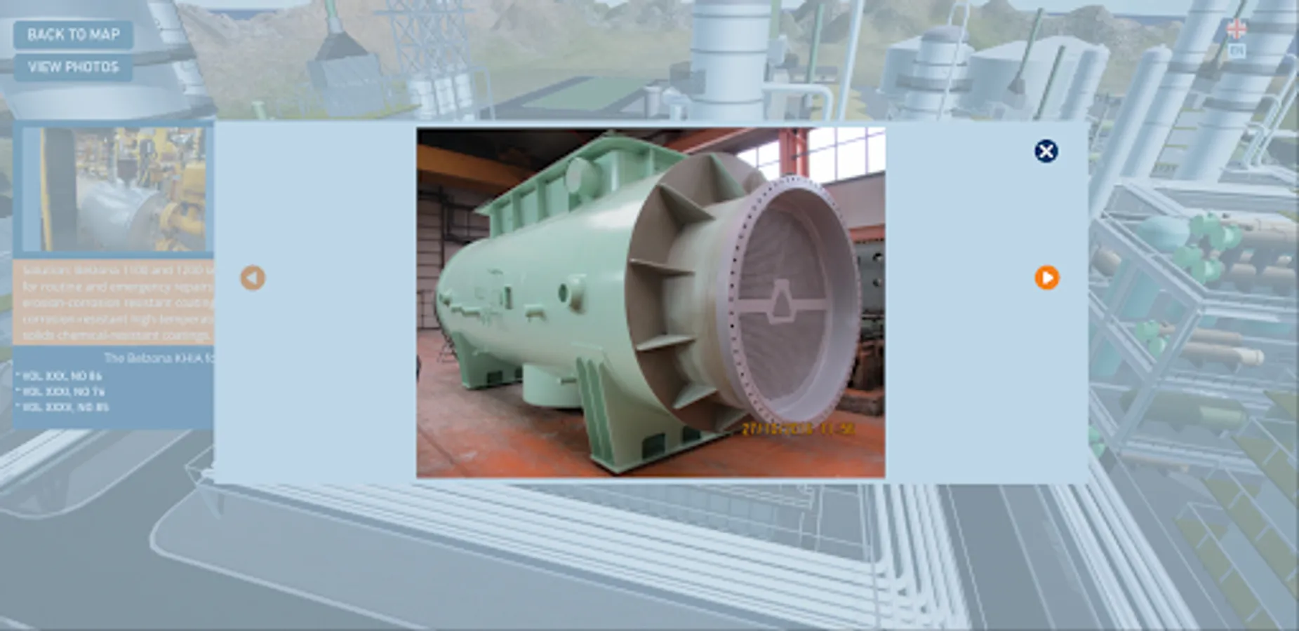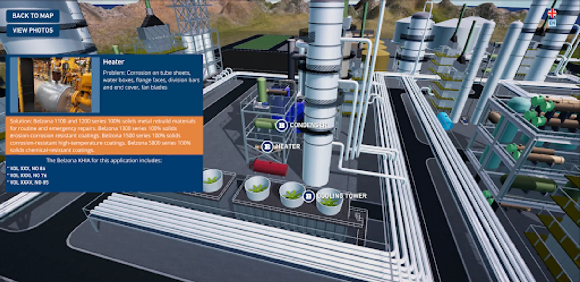 Belzona Solutions Map for the oil refinery industry is an interactive 3D map showing different sections of the refinery machinery and equipment. The map serves as a tool that helps identify where repair and maintenance problems can occur and what solutions Belzona offers. Additionally, the map provides references to relevant case studies, includes photos and videos.