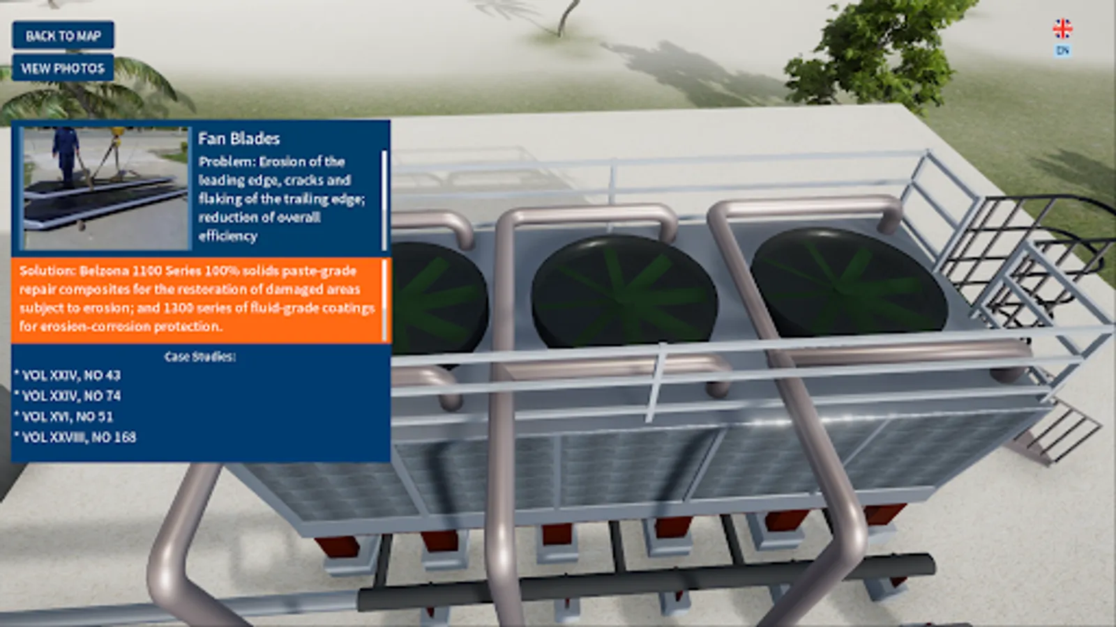 Belzona Solutions Map for the HVAC industry is an interactive 3D map showing different sections of the HVAC machinery and equipment. The map serves as a tool that helps identify where repair and maintenance problems can occur and what solutions Belzona offers. Additionally, the map provides references to relevant case studies, includes photos and videos.