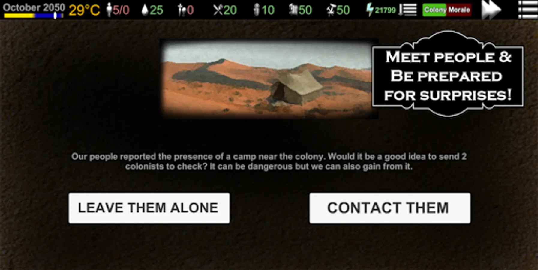 * Make wise decisions when your colonists ask for your opinion or ask for your help because the welfare and the future of the colony will depend on you.