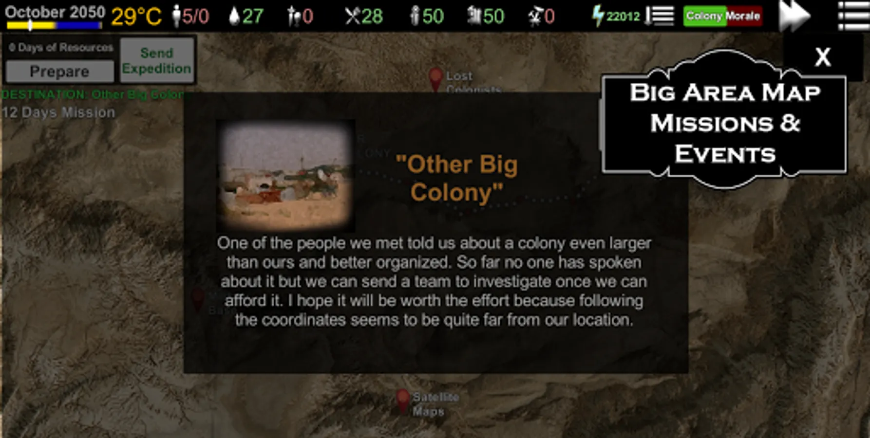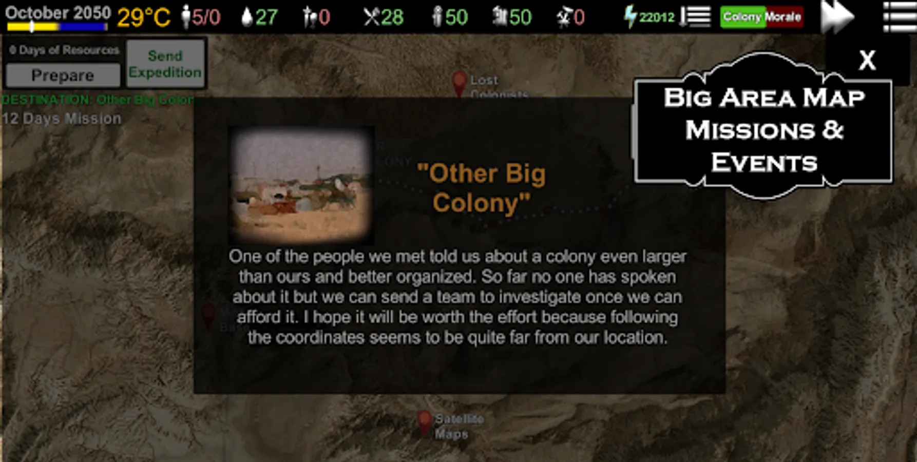 * Discover the big map around the colony and send research teams in missions to find a way for a better life.