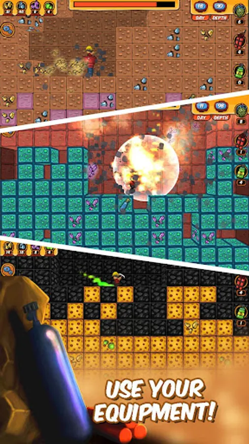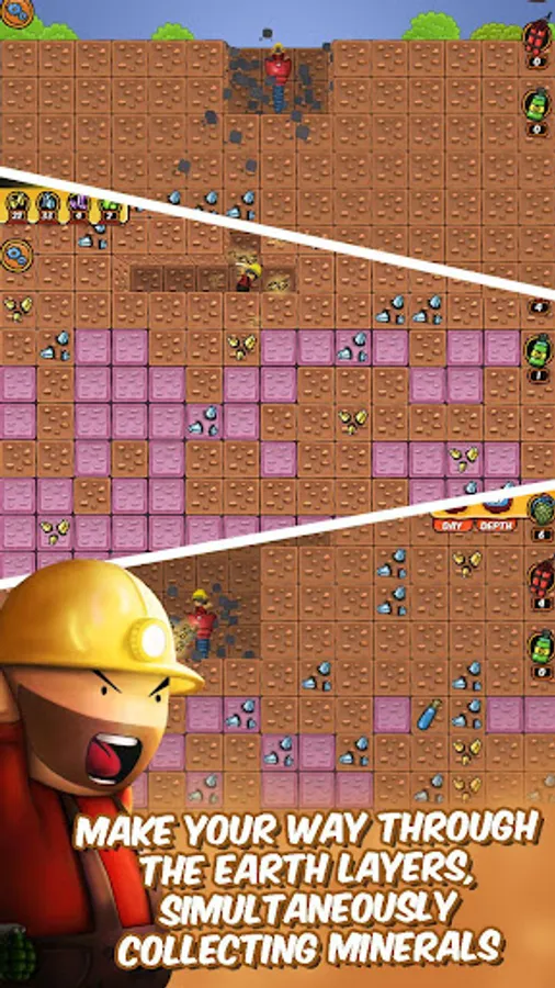 Your task is to dig earth deeper and deeper and for gems until you find and mine the treasure. It's not as simple as it seems. The oxygen runs out with every descent, you need to extract minerals to improve your equipment and tools as well as to buy grenades and dynamite to make the descent faster.
