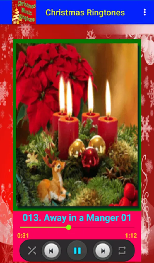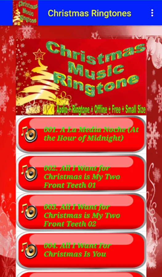 "Christmas Music Ringtone" allows us to enjoy the magic of Christmas via our Android gadget. Let's enjoy the most known of Christmas Carol music such as Carol of the Bells, Dance of the Sugar Plum Fairies, Grandma Got Run Over by a Reindeer, Once upon a December, etc. Let's experience the beauty of Christmas. Available while offline (no internet connection). No more waiting time for streaming. No more hitch.