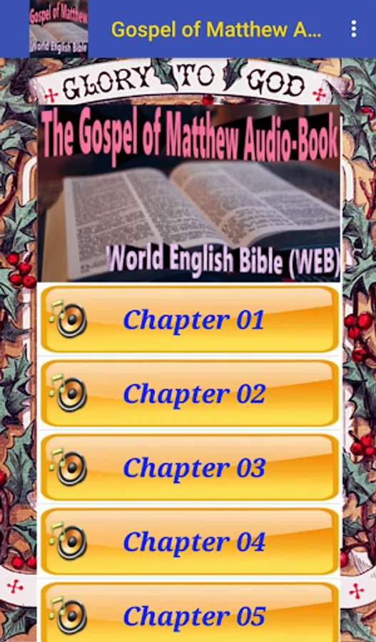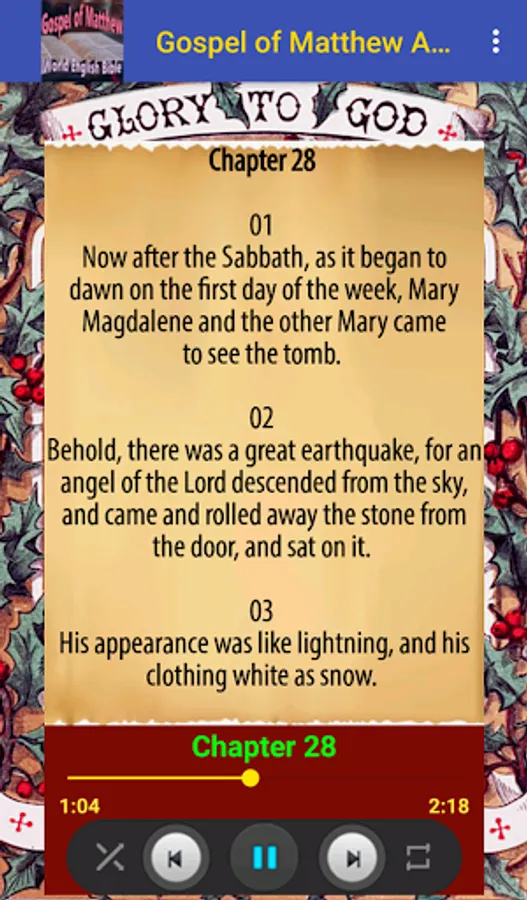An app for anyone who want to know about Christianity directly from the source (Bible). Enjoy Complete chapter of The Gospel of Matthew in good quality audio with transcript (text). Enjoy the beauty of God's word anytime and everywhere -- even without Internet connection (offline) -- via your Android gadget. This app presents you the complete chapter of The Gospel of Matthew based on World English Bible (WEB). You can enjoy it all in quick, simple, and easy way. A must for devoted Christian.