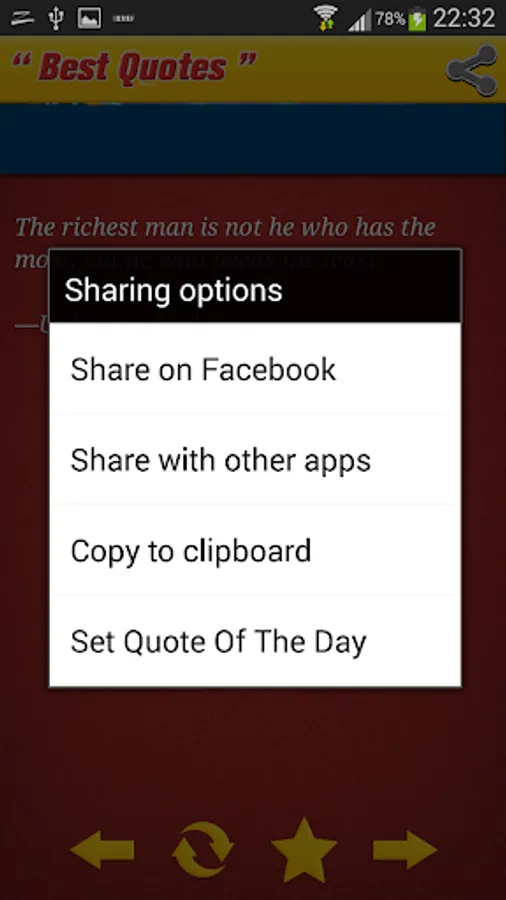 • Share and Send Famous Quotes through SMS, ,Facebok , Twitter , WhatsApp or others to inspire, motivate and inspire your close ones.