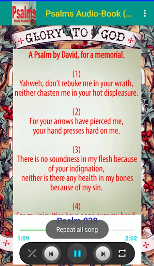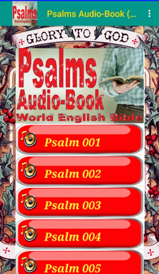 Install Psalms Audio-Book and enjoy the holy inspiration of 150 psalms in high quality audio with transcript. Let's enjoy the magical beauty poem of praise and worship to God. Enjoy the intimation of conversation with our Lord, Yahweh.