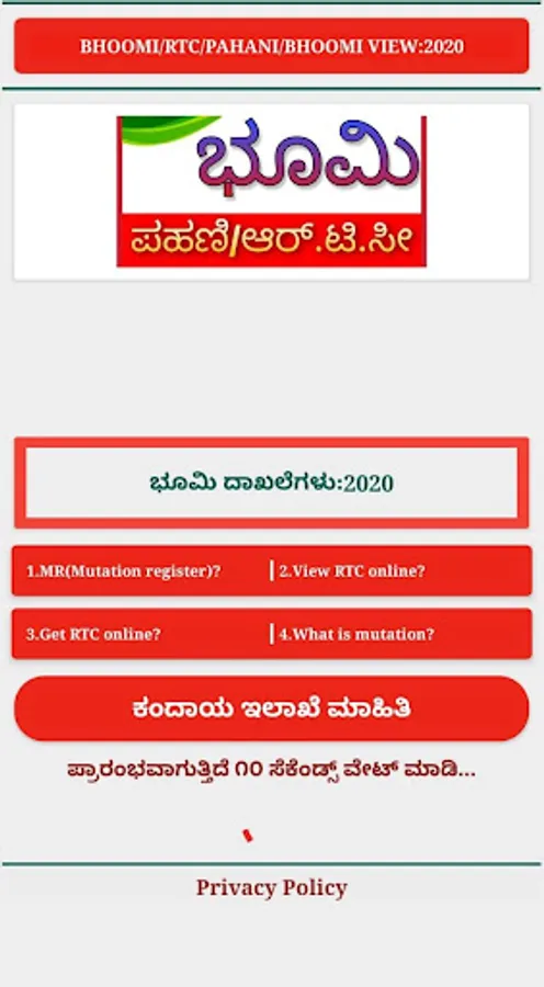 Desclaimer:This application is designed and developed for public services to help peoples of Indians to find latest their Karnataka Bhoomi Records in the country of their own areas,you can use this app for personal purposes only,this application is not related or affiliated of any government and any government services or peoples or persons.