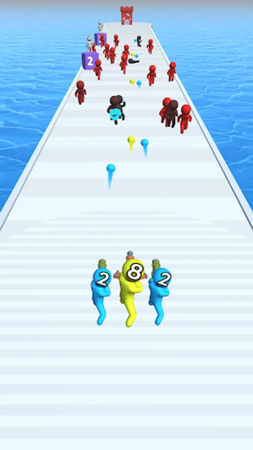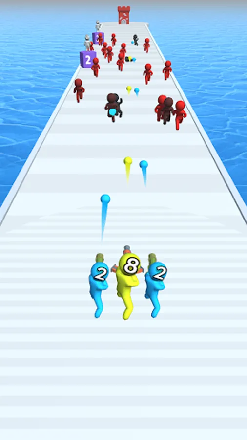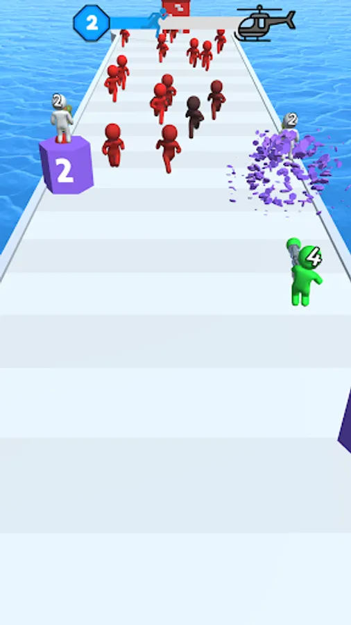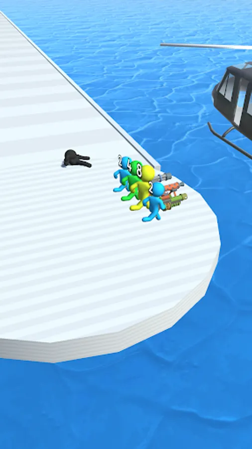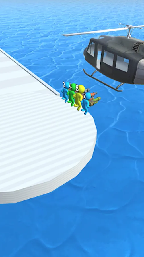 Collect and combine characters. Destroy the enemies and get on the helicopter.