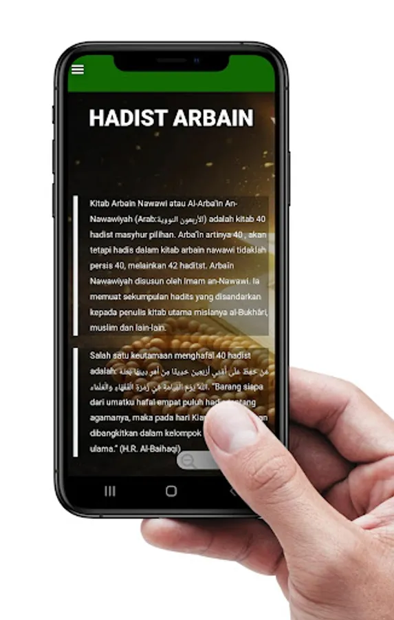 This feature contains 42 hadiths accompanied by Arabic writing, and their Latin translations.