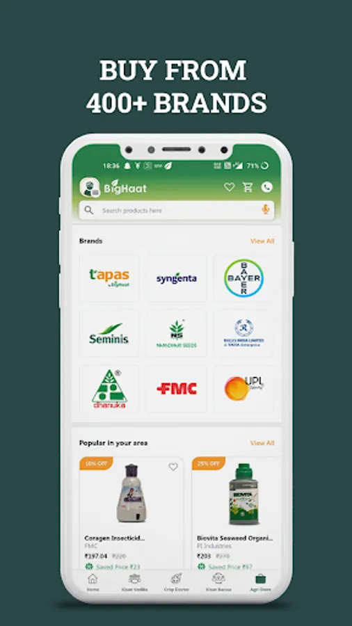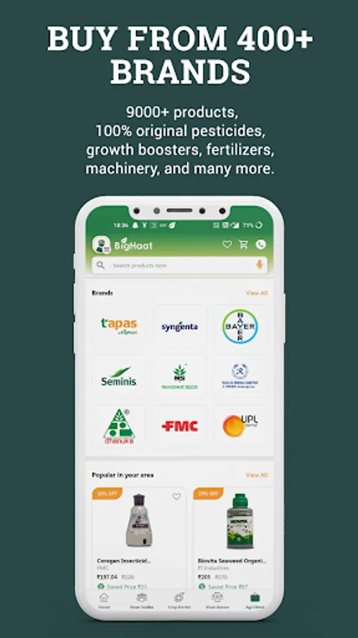 BigHaat App has major agricultural brands available online, including local manufacturers & vendors. In fact, BigHaat digital kheti badi platform for farmers has brands you won’t find anywhere else. You can get delivery of season-specific brands, dairy and poultry products, specialty nutrients, chemicals & fertilizers, seeds and planting material, farm machinery, and equipment online anytime, anywhere.