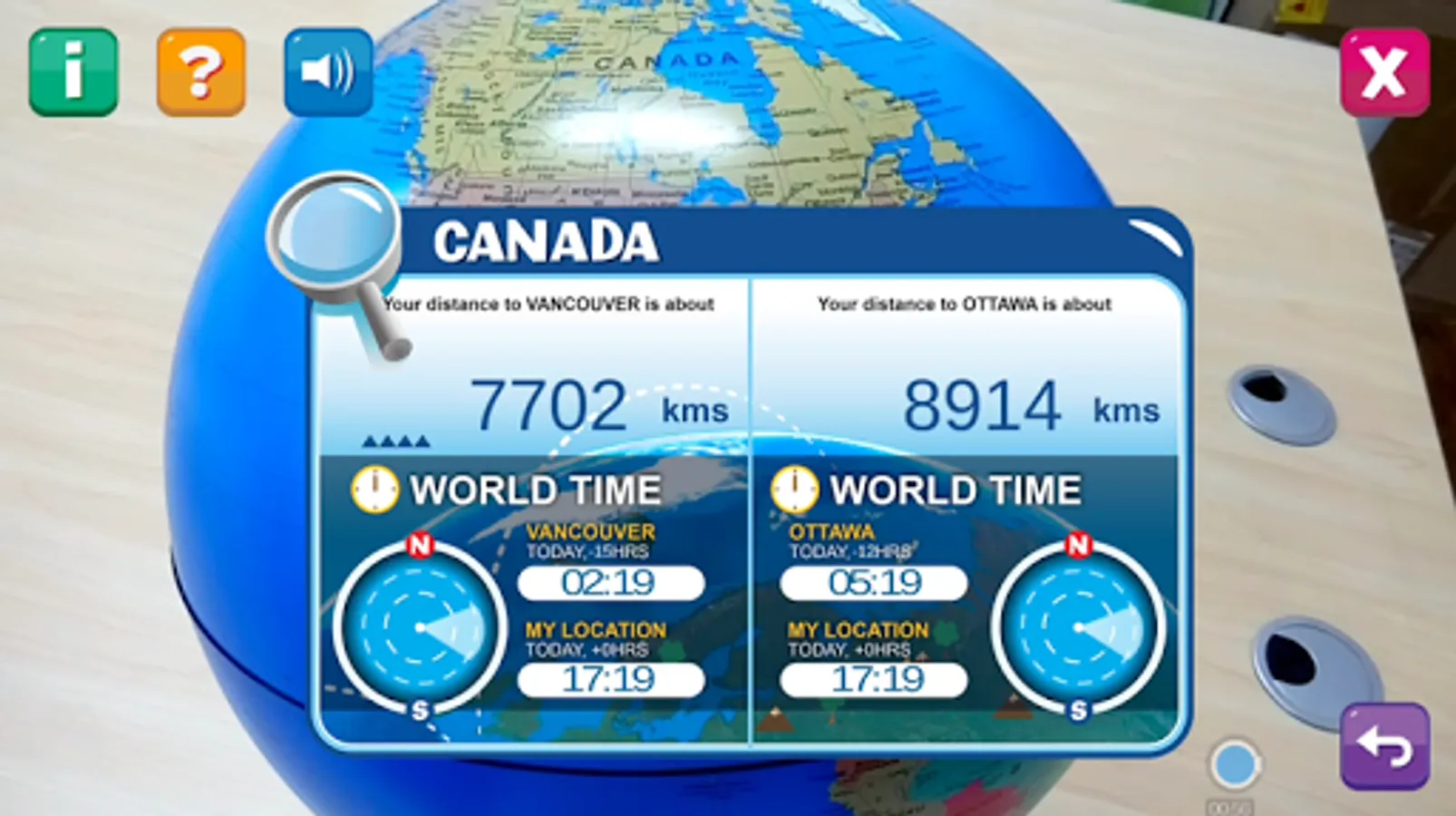 Scan the globe for national landmarks and flags, and click on landmarks to show the country.