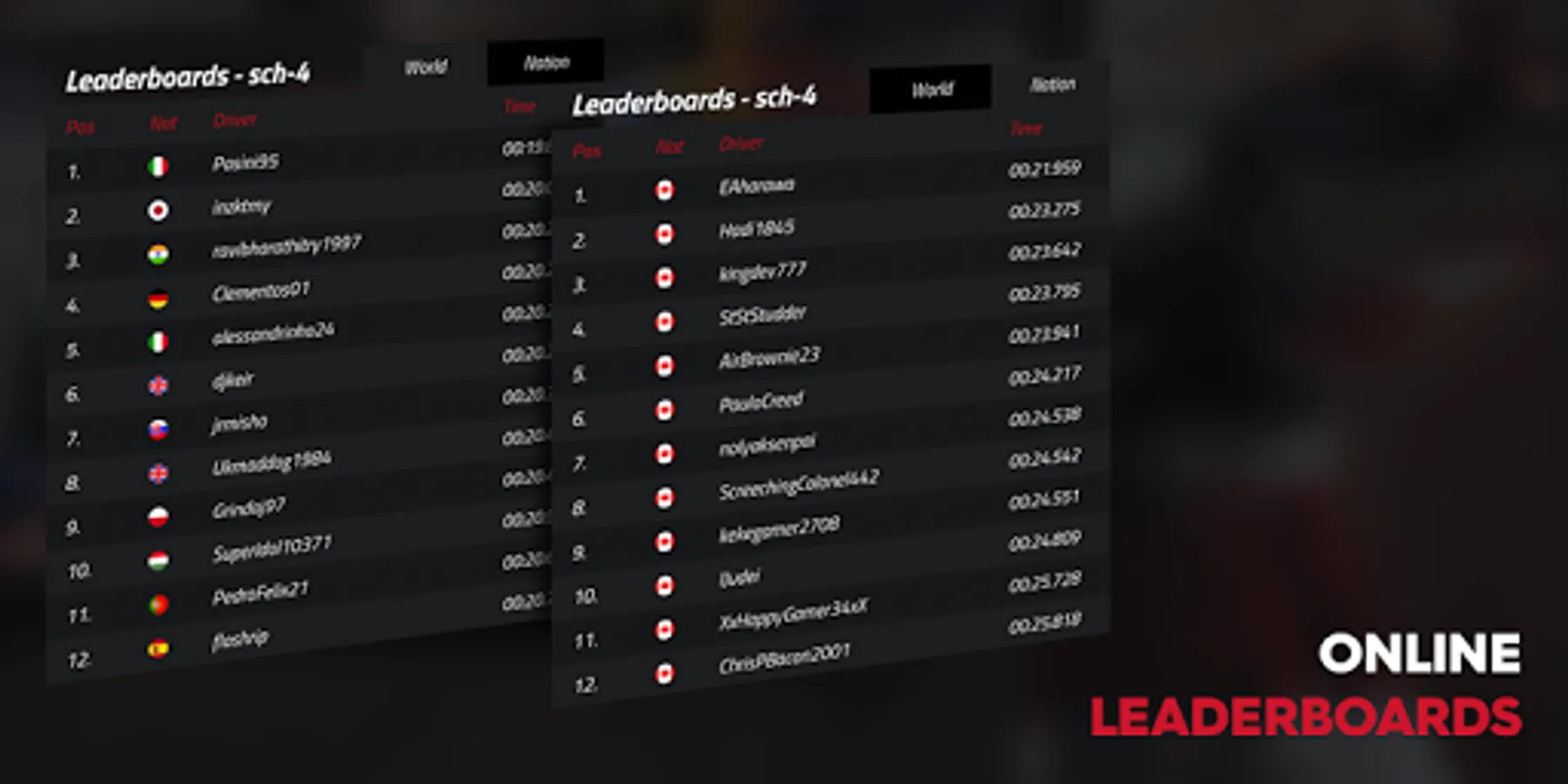 - Online world and national leaderboards of formula drivers for each track
