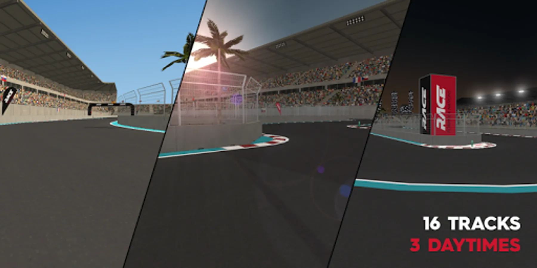 Tracks are divided into 4 difficulties, which are school, short, medium and long. Each track has 4 race times for surpassing, for which you'll be rewarded with trophies and coins. Tracks are similar to city tracks, that you know from F1 racing -- there are concrete walls near the track and small run-off zones.