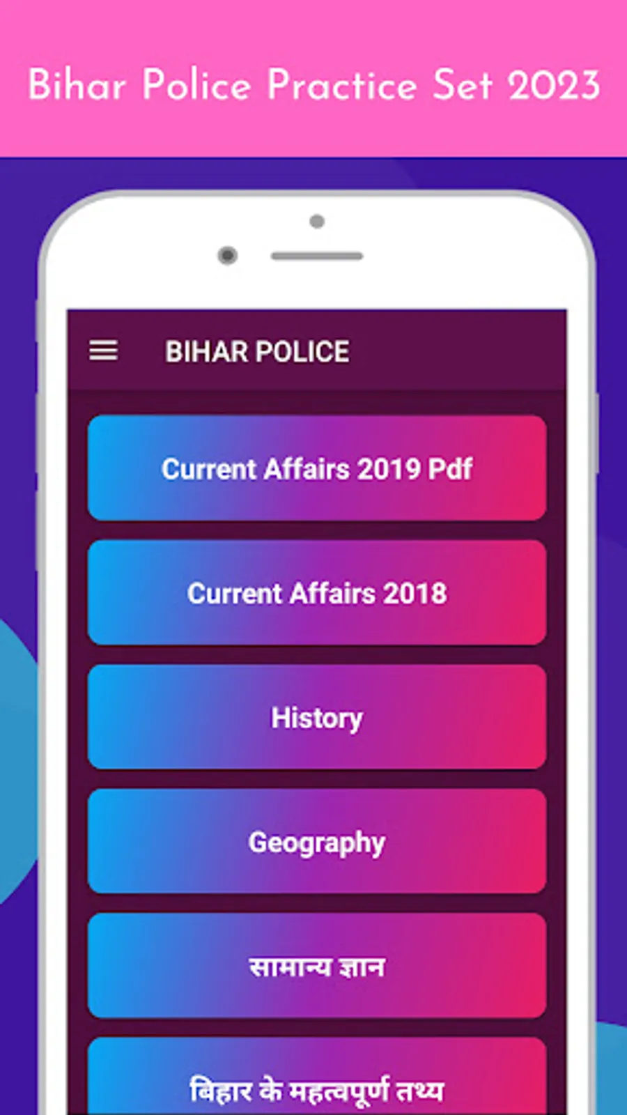 यह ऍप उन सभी छात्रों के लिए जो Bihar Police Practice Set 2023 की तैयारी करना चाहते है इस ऍप की मदद से बिहार पुलिस की तैयारी कर सकते है इस ऍप में डेली करंट अफेयर्स ,समान्य ज्ञान ,समान्य विज्ञान का quiz भी दे सकते है।
