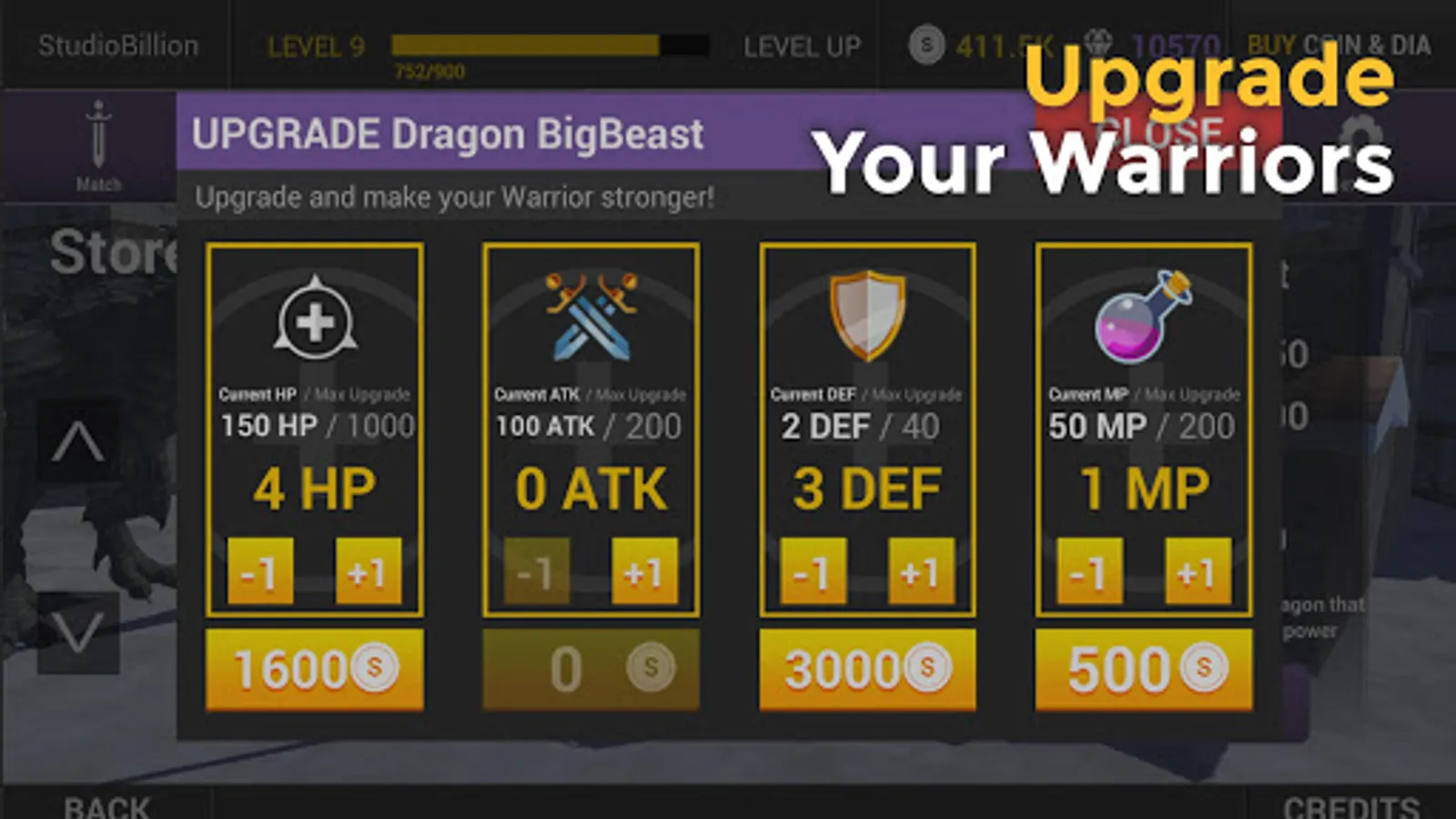 ● Each Warrior can upgrade it’s health points, attack, magic and defense power according to their warrior kind.