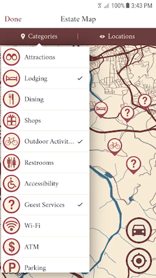 - Use the interactive, GPS-enabled map to locate points of interest across the estate, as well as restaurants, shops, and restrooms.