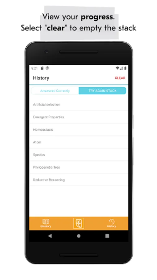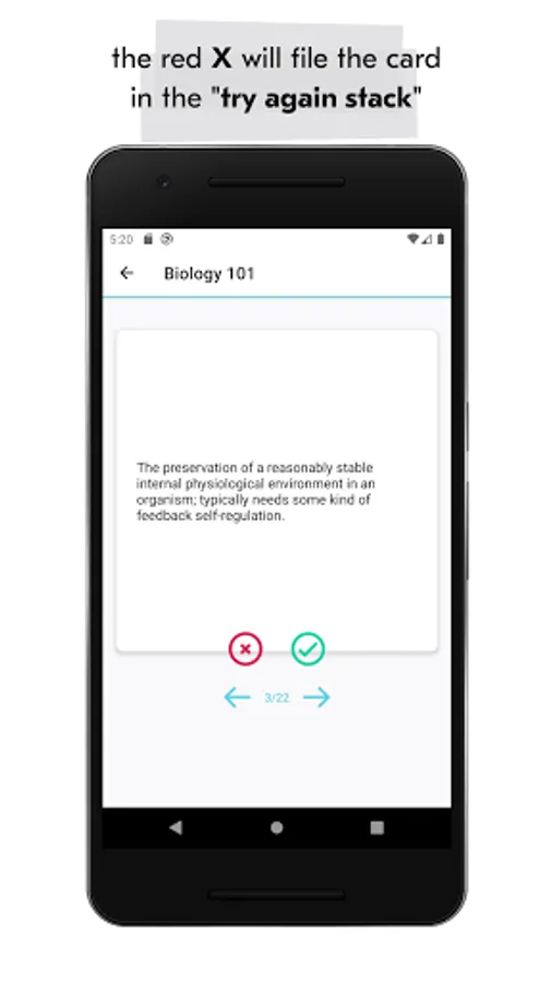 As a study tool, you can quiz yourself on any card using the flashcard feature. If you get the answer right, you can place the card in the “Answered Correctly” pile. If you get the answer wrong, you can place the card in the “Try again stack” pile. This allows you to isolate the incorrect cards and quiz yourself on your weak points later.