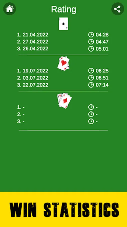 We have provided three difficulty levels for Spider Solitaire: 4 suits, 2 suits and 1 suit. We advise you to start playing cards starting with the 1st suit and then move on to more difficult levels. If you manage to play solitaire, then your result is recorded in the high score table.