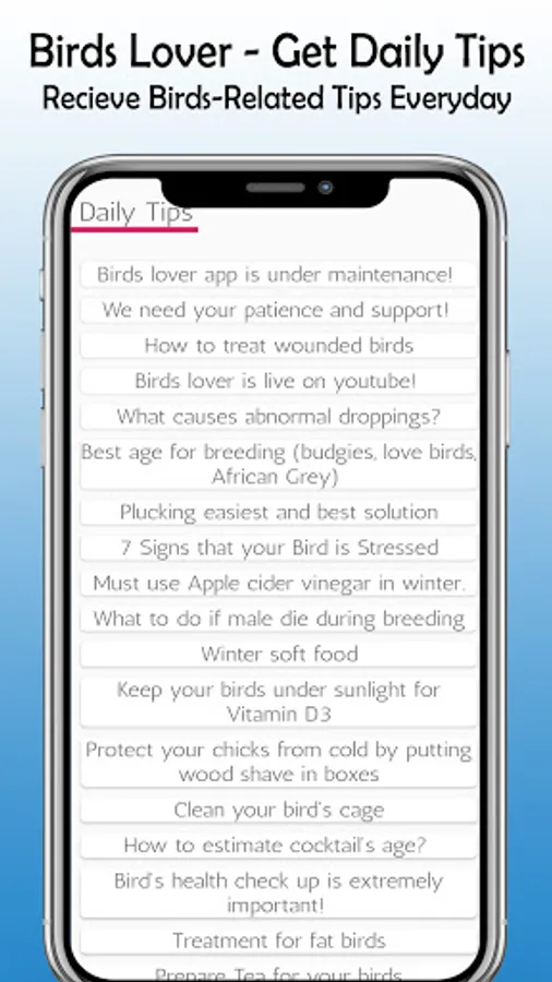 > Get daily tips about how to take care of birds. We will notify u what to do every day to keep your birds and parrots healthy, active, and disease-free.