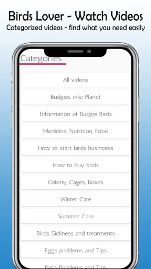 > All videos are categories based on content i.e How to buy good pairs, breeding tips, birds and parrots' sickness, and their cure, how to make pairs, how to choose good pairs for breeding, etc.