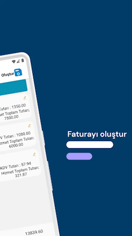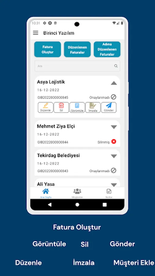 Our application is a mobile application integrated with the mandatory 5,000 TL and 30,000 TL invoicing transactions (and optionally, invoicing below 5,000 TL) in the Revenue Administration (GIB) E-archive E-invoice portal. In this application, sales, withholding, special basis, exception and return invoices can be created and the issued invoices will be displayed. In addition, operations such as saving and sharing invoices in pdf format, signing invoices, creating customers and creating recorded notes can also be done. In addition, invoices issued in his name can also be viewed through this application.