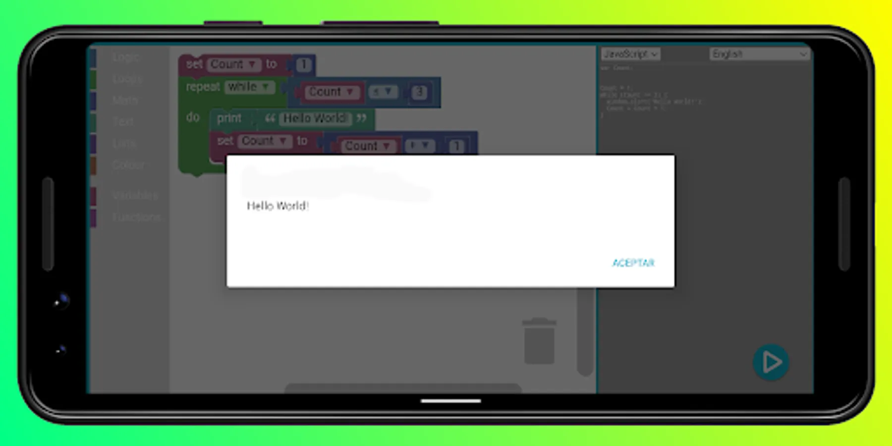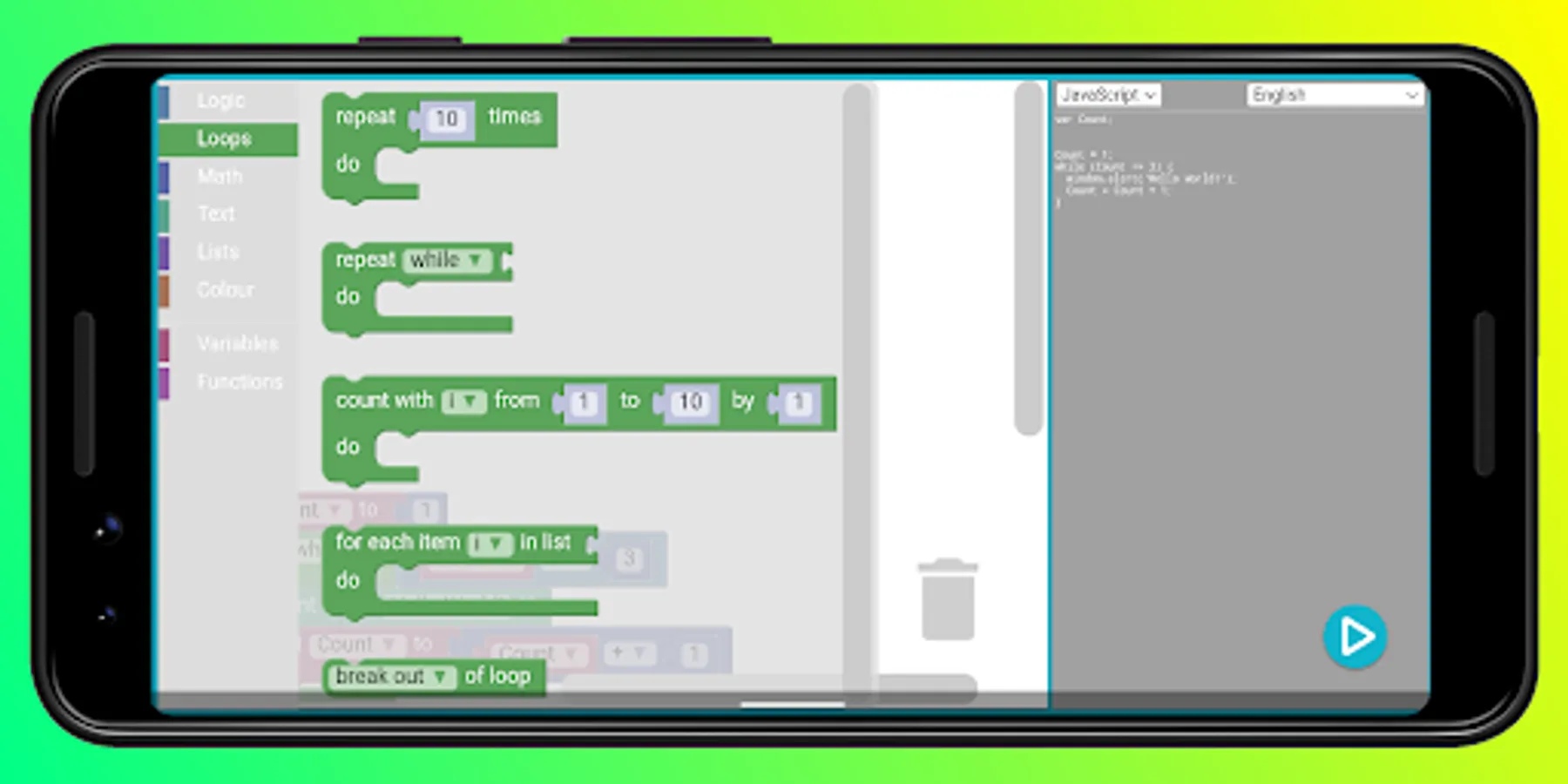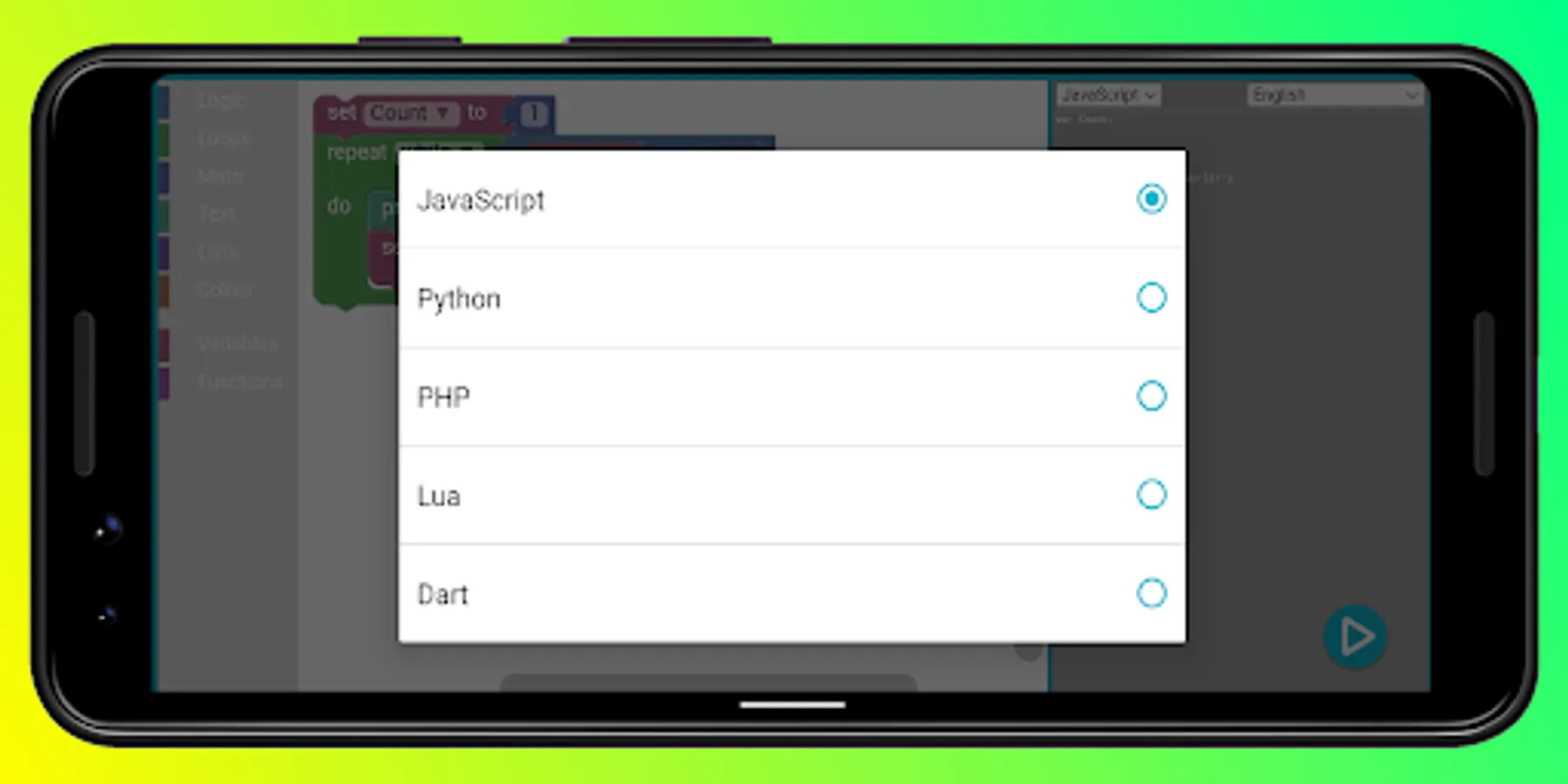 You can program 5 languages on blocks PHP, PYTHON, LUA, DART, JAVASCRIPT, Code of google