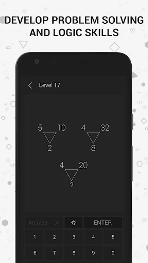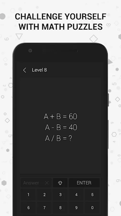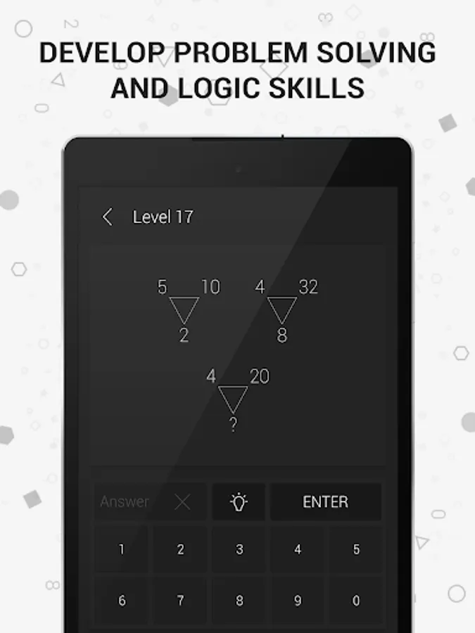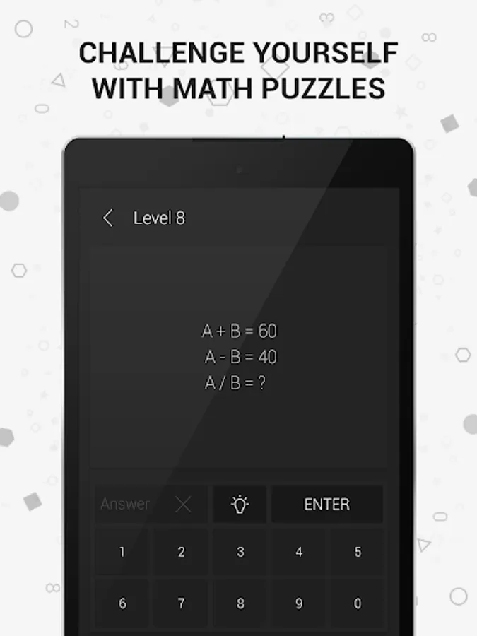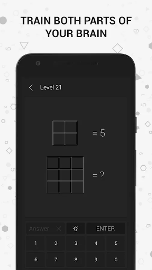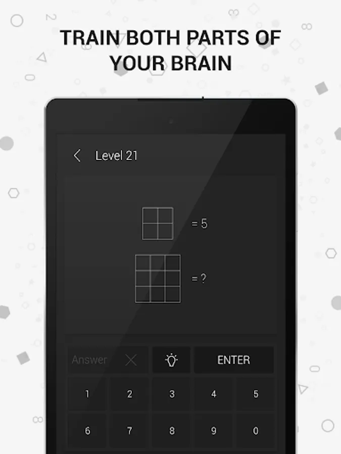 Math riddles reveal your mathematical talent through brain games that are hidden in geometrical shapes. You will train both parts of your brain by exploring the relations between the numbers in the geometrical shapes, and you will stretch the limits of your mind sharp.