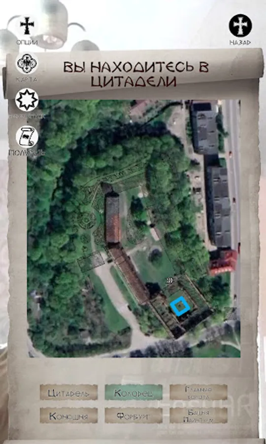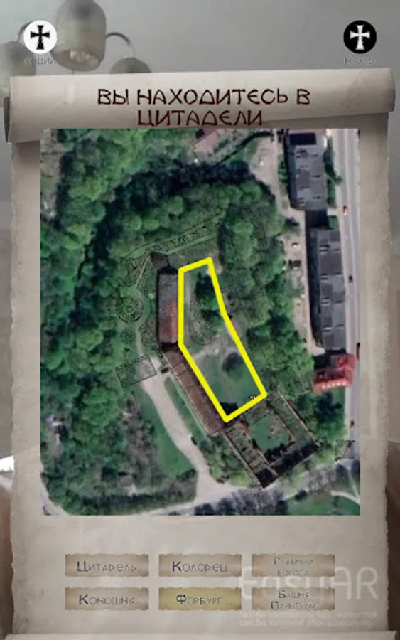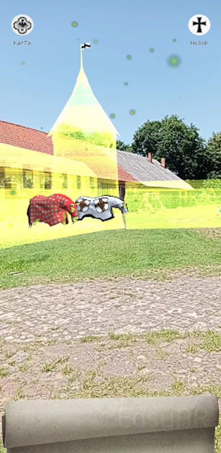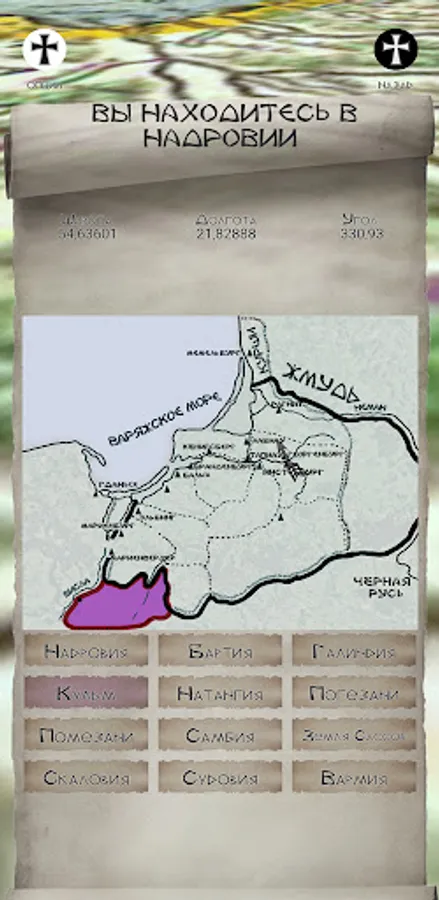 The application shows the user's position inside the archaeological site Insterburg Castle and its general position on the map of the Prussian lands. When the user is in the Insterburg castle, he has the option of overlaying the 3D model of the castle on the real area, which allows him to orient himself when examining this monument. The most important objects on the territory of the castle and the territory of the Prussian tribes can be highlighted using the buttons with their names.