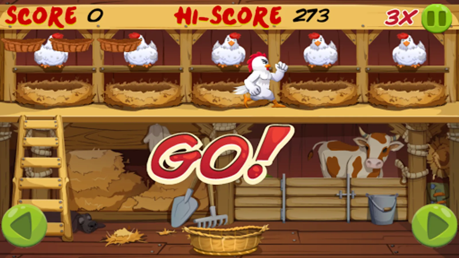 In this chicken game you must race against the crazy chicken that drops eggs, called ' Angry Chicken ' and become an egg catching ninja! Catch as many eggs as you can while they drop, avoid the bad stuff and use the super power eggs to your advantage. If you miss 3 eggs and they drop down, you lose.