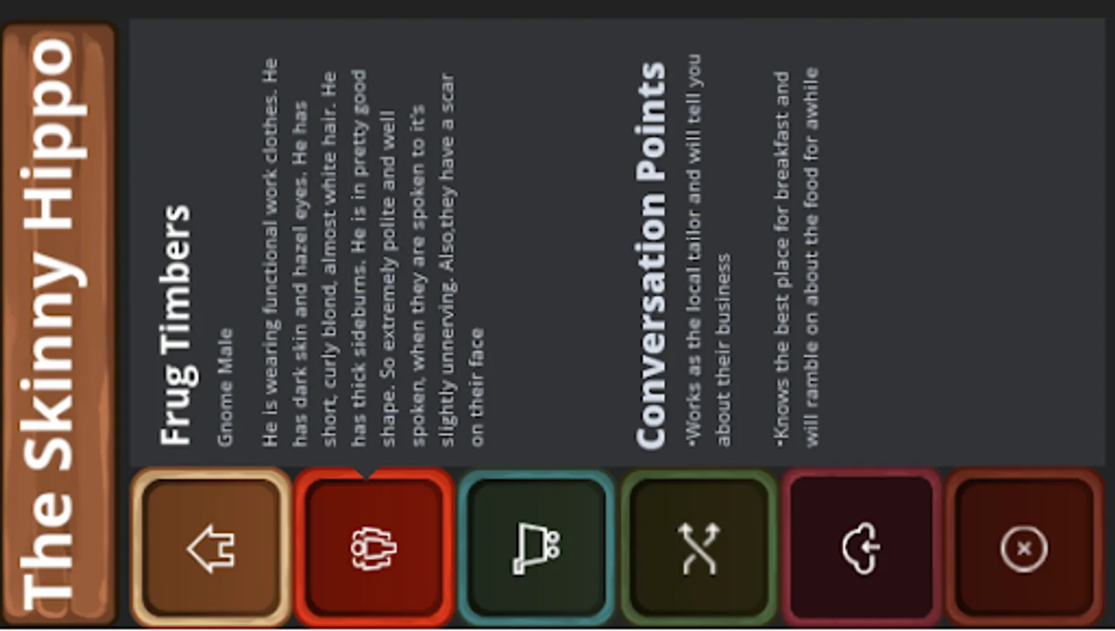 This is a tool I built myself for dungeons and dragons. As I don't have a tutorial in app the first button on the side is the description on the tavern, second going down is the patrons, each name will have a description and talking points connected to them. The third is the menu, and the fourth is the generate tavern button. The fifth is a save button which does not work for now but if I get 1k downloads I will add it. Lastly is the exit button. The interface isn't great and there are a few bugs. I am releasing this to the public to see if there is any traction for it. I will update the interface and add to the generator if anyone actually downloads this.