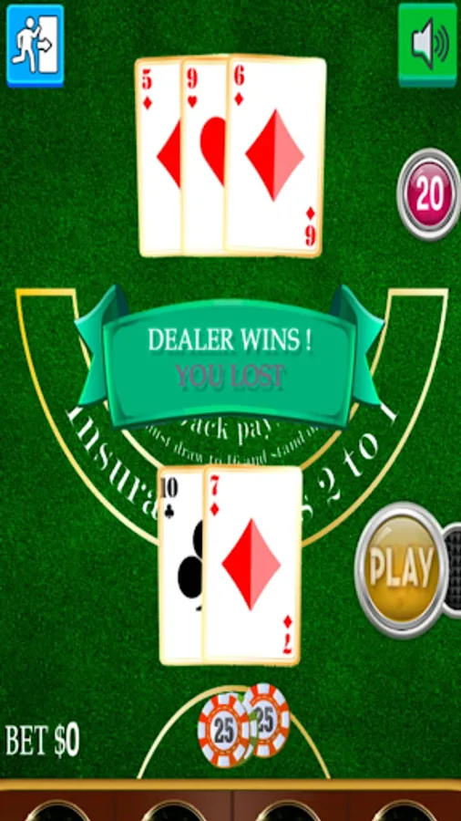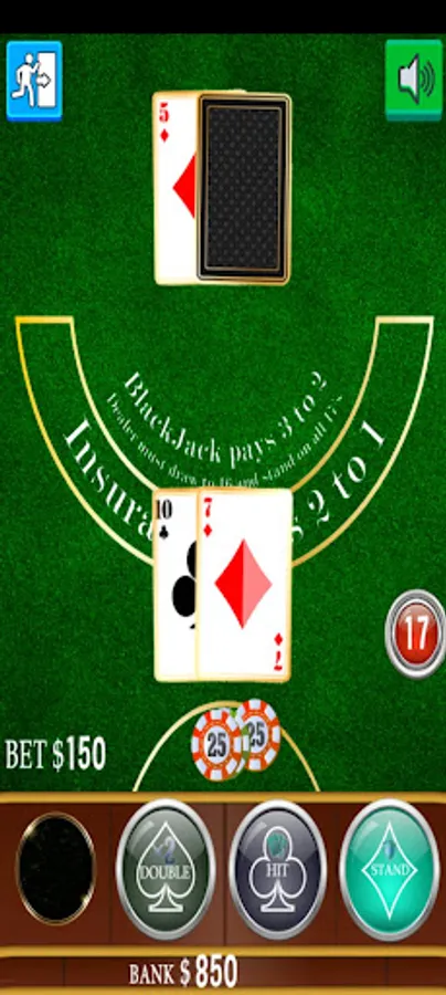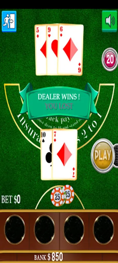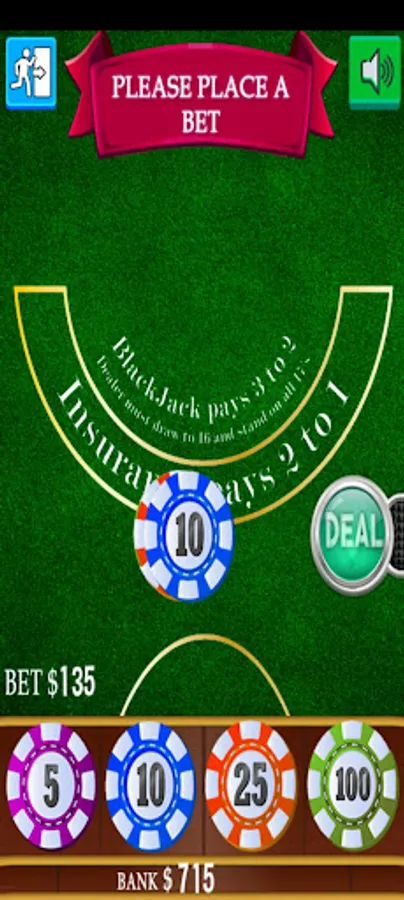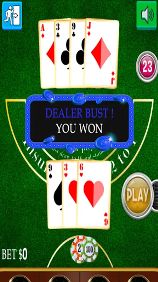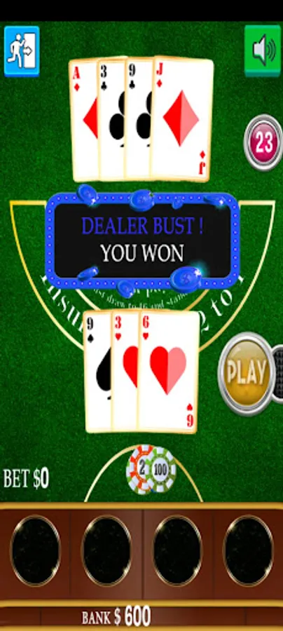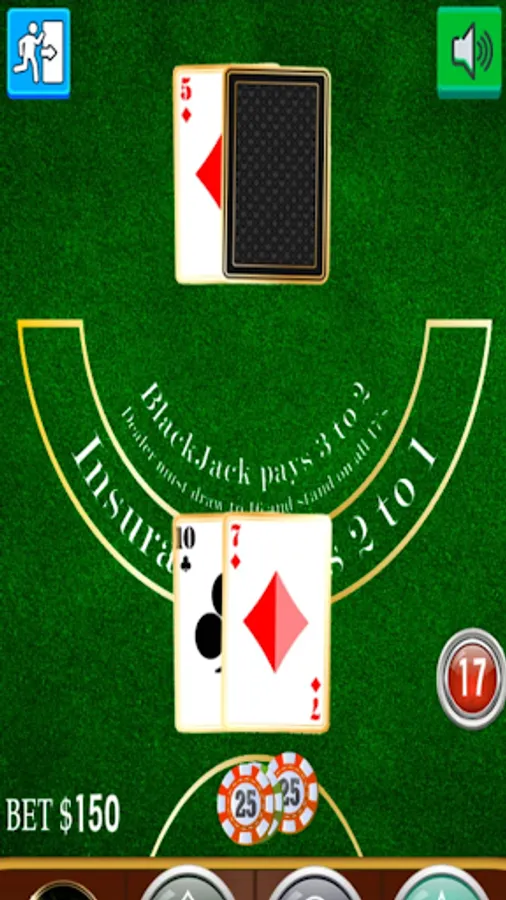 Blackjack is a card game that pits the player against the dealer. It is played with one or more decks of cards. Cards are counted as their respective numbers, face cards as ten and ace as eleven or one (in our game it will show up on the counter as 11 unless you are over 21). The object of Blackjack is to beat the dealer. This can be achieved by getting Blackjack (first two cards equal 21) without the dealer's Blackjack, making your final card count greater than the dealers without exceeding 21, or not exceeding 21 and the dealer removing upon exceeding his count of cards of 21.