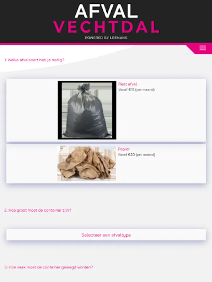 You are just a few clicks away from an affordable solution for your industrial waste, select your waste container, tick how often it may be emptied and everything will be arranged for you!