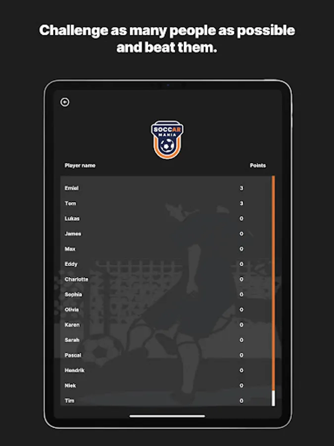 With SoccAR mania you play together for the win in a cool soccer game. Place the 3D football pitch wherever you want and see who is the best Augmented game player. Try to win as often as possible and maybe you will be the SoccAR mania topper that will be at the top of the score list.