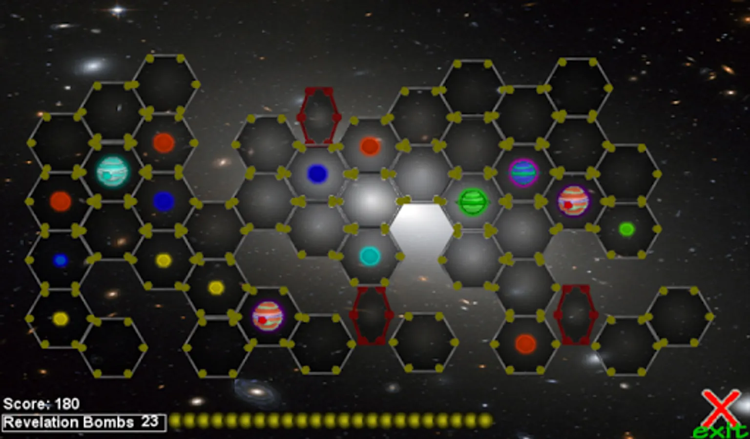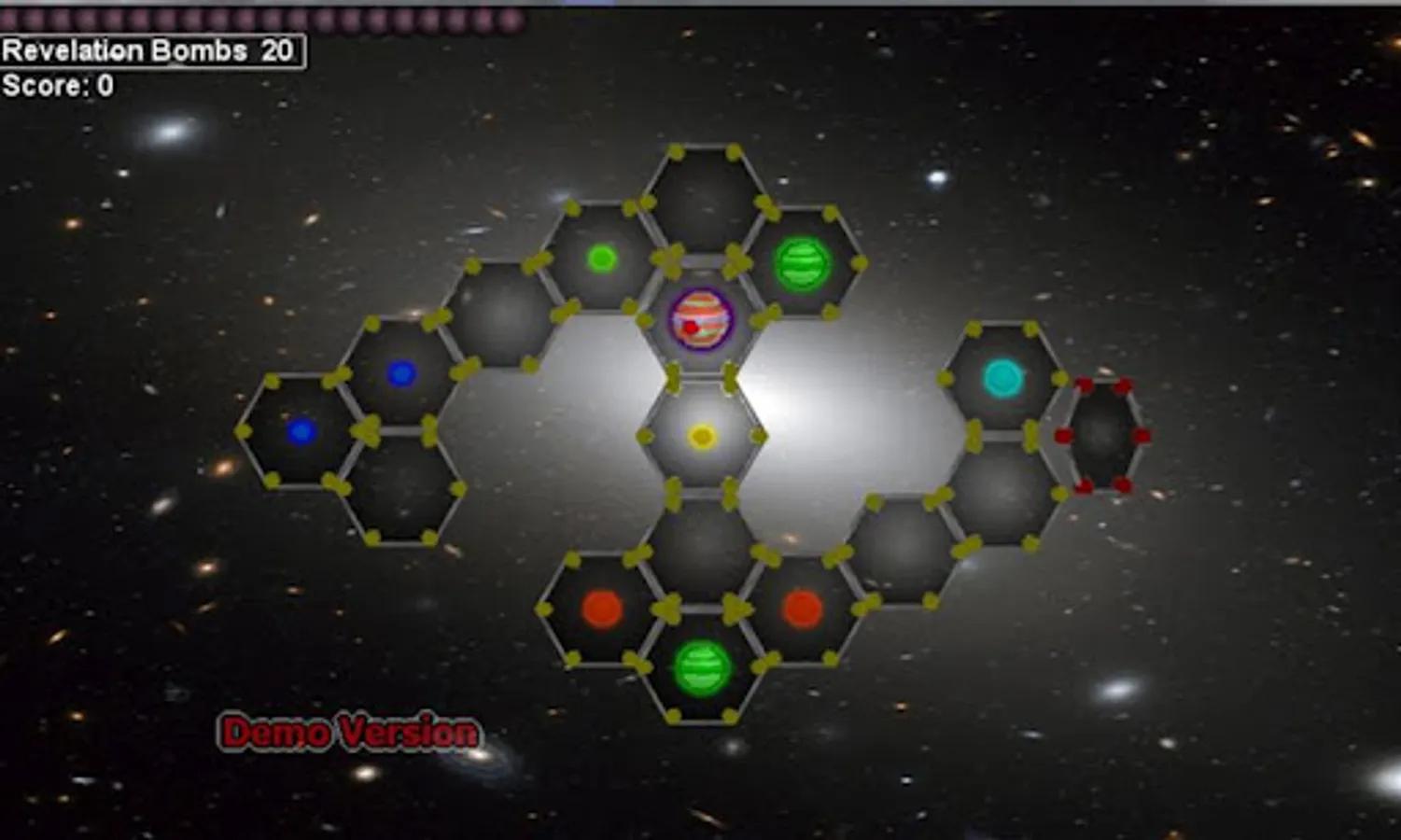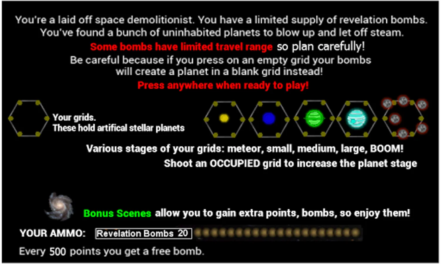 You're a laid off space demolitionist. You have a spare supply of Revelation Bombs to blow up uninhabited planets, moons and planetoids. Your bombs have limited range, so you must plan your moves accordingly. When a planet, moon or planetoid blows up, it's projectiles add to your score, and every 500 points, adds to your ammo inventory.