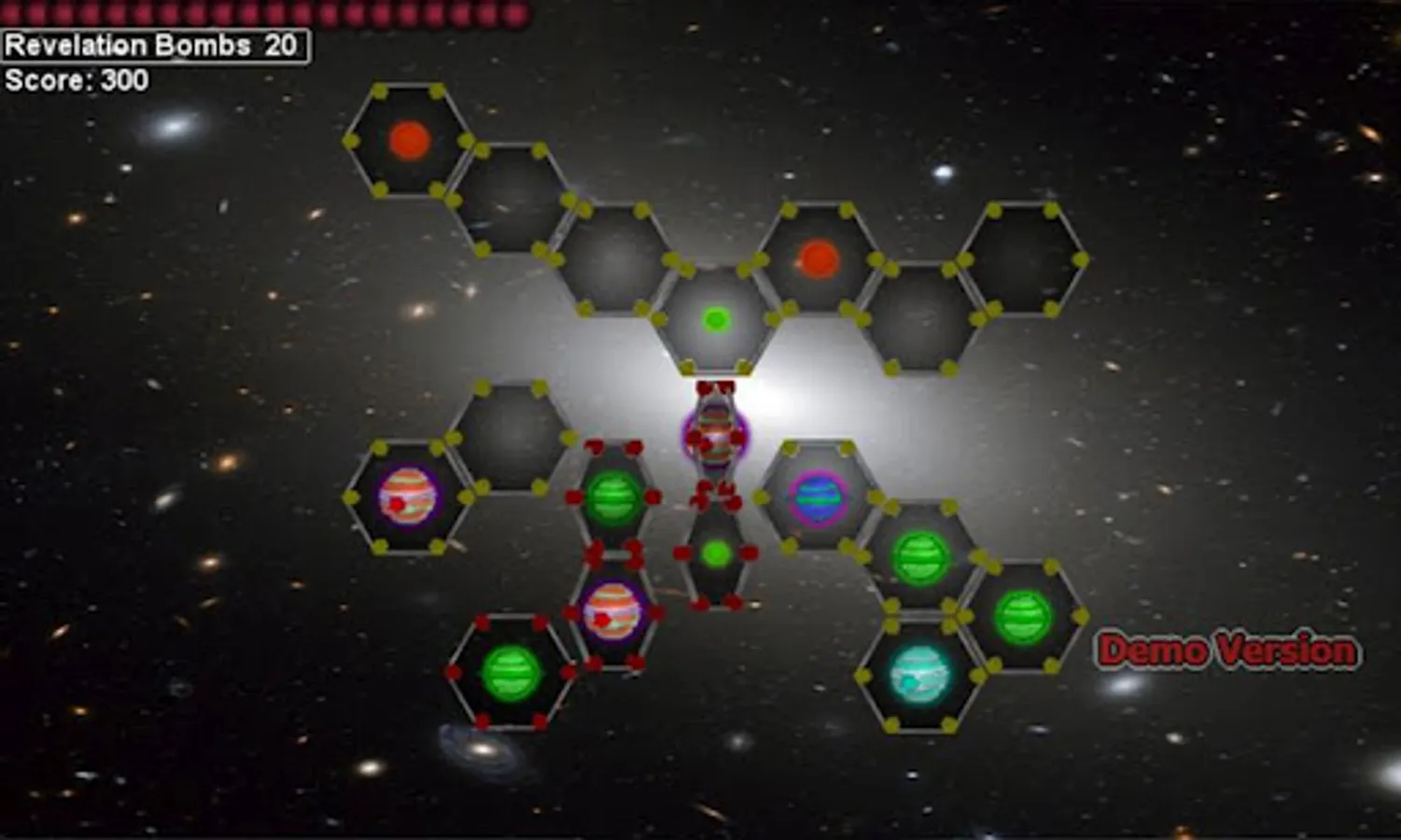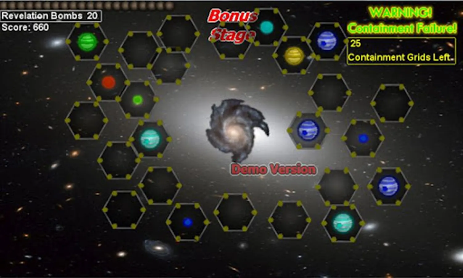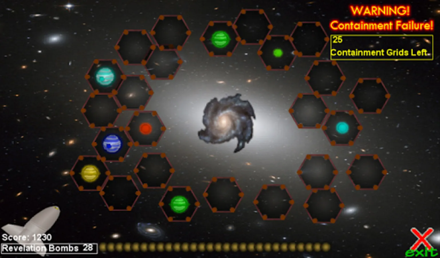 You're a laid off space demolitionist. You have a spare supply of Revelation Bombs to blow up uninhabited planets, moons and planetoids. Your bombs have limited range, so you must plan your moves accordingly. When a planet, moon or planetoid blows up, it's projectiles add to your score, and every 500 points, adds to your ammo inventory.