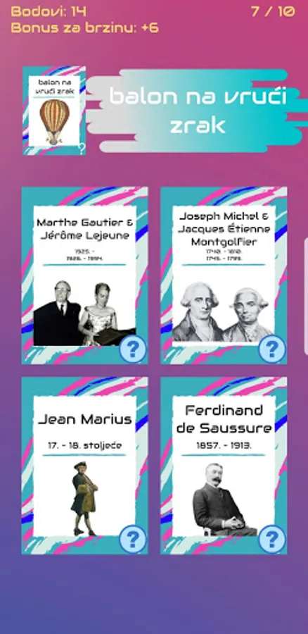 Science à la carte is an educational game on the topic of important achievements of scientists and inventors originating from Francophone countries around the world. The game was created as a result of the joint work of students and teachers of the Department of French and Francophone Studies at the University of Zadar in April 2021 as part of the Science Festival project.