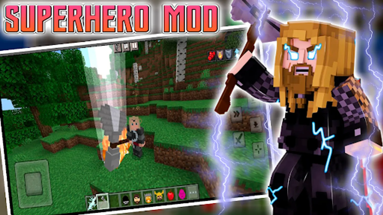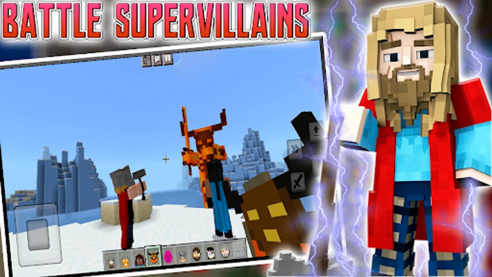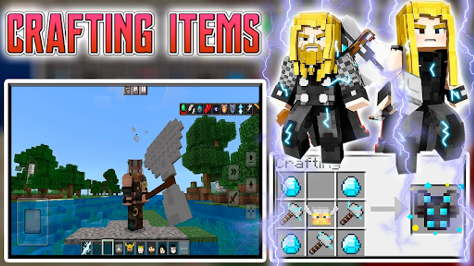 Take on the role of a powerful Avenger, god of thunder and protector of Asgard. As a new threat looms on the horizon, you must gather your legendary weapons and use your powers to save the pixelated universe of Minecraft Bedrock from destruction. With your trusty hammer Mjolnir, you will travel through cubic biomes and face fearsome enemies, from giants to supervillains and more. The popular Minecraft Thor addon is designed to bring the action-packed world of the Marvel universe to the blocky world of Minecraft PE. Players will be able to explore new blocky worlds and dimensions and fight legendary villains from the Avengers franchise. Choose your favorite MCPE superhero skins in our app and start discovering new abilities and upgrades, customizing the gameplay to suit your play style. The best MCPE Thor mod will add new characters to the game, such as: Loki, Odin, Valkyrie, Heimdall, Hela, Surtur, Gorr the butcher god, Korg, Zeus, Beta Ray Bill, Lady Sif. As the god of thunder himself, players will wield the legendary hammer Mjolnir and use its incredible power to strike enemies with lightning and overcome obstacles. In addition to Mjolnir, players will have access to many new craftable weapons and powerful armors, such as Thunderbolt, Yanbjorn, Hofund, Valkyrie's Dragonfang, Surtur's Sword, Hela's Sword, Asgard Thor's Armor, Thor's Golden Battlesuit, and more inspired by MCPE Avengers mods such as the legendary shield from Minecraft Captain America mod and the repulsor beams from Minecraft Iron Man mod.