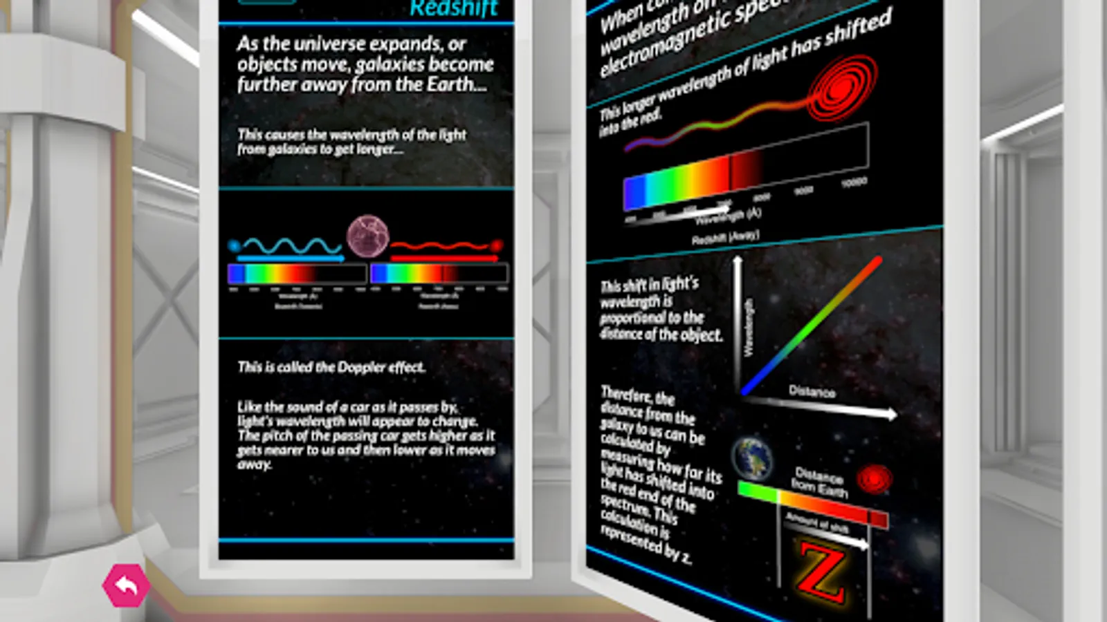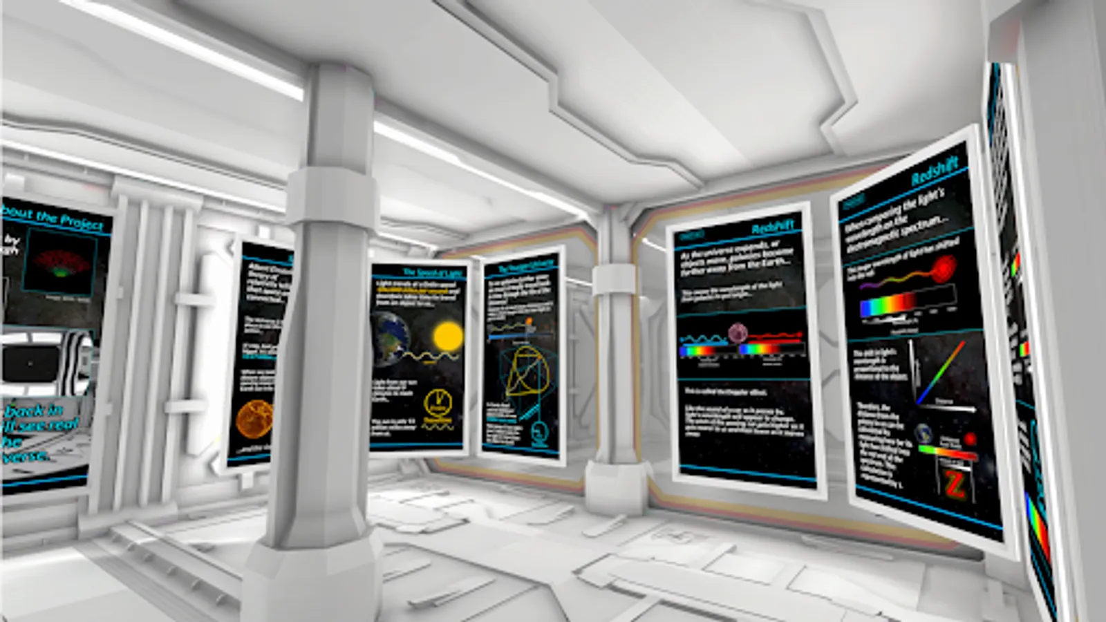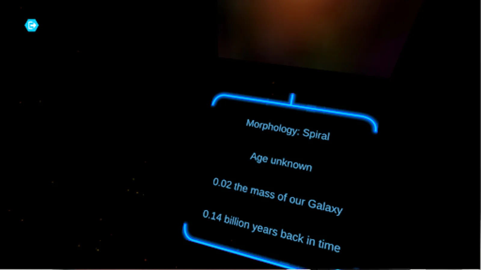 The app takes you to the virtual Exhibition, which gives the user an explanation to the nature of the universe and how we can travel back three billions years and explore these distant objects. Then step through the airlock and look around at actual images of galaxies and move amongst them.