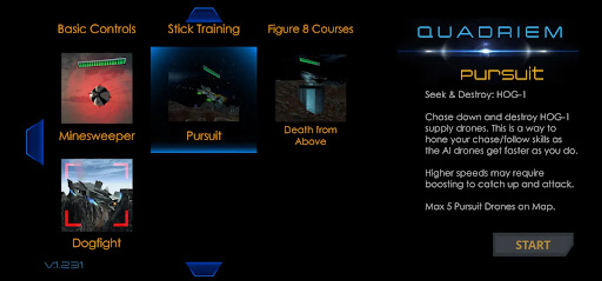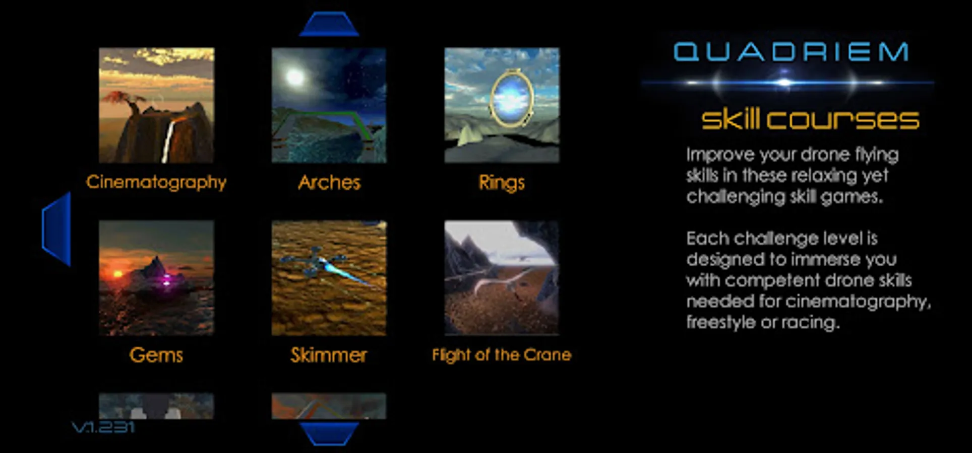 Immerse yourself in learning standard or FPV drone quadcopter controls with a suit of mini games including courses, ground skimming, and combat for hours of things to do using quadcopter controls.