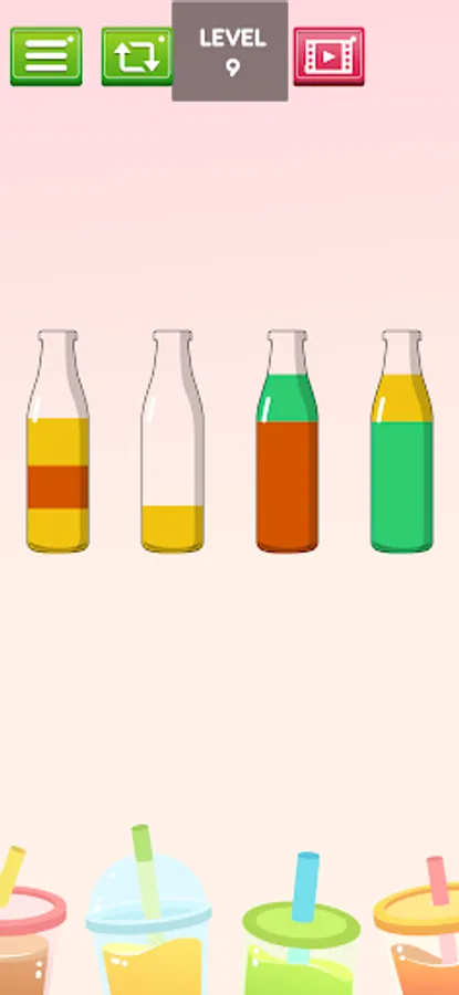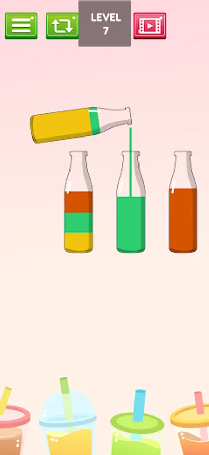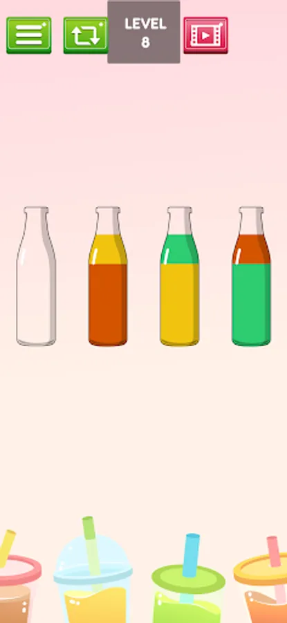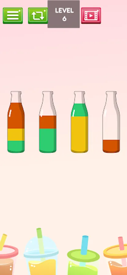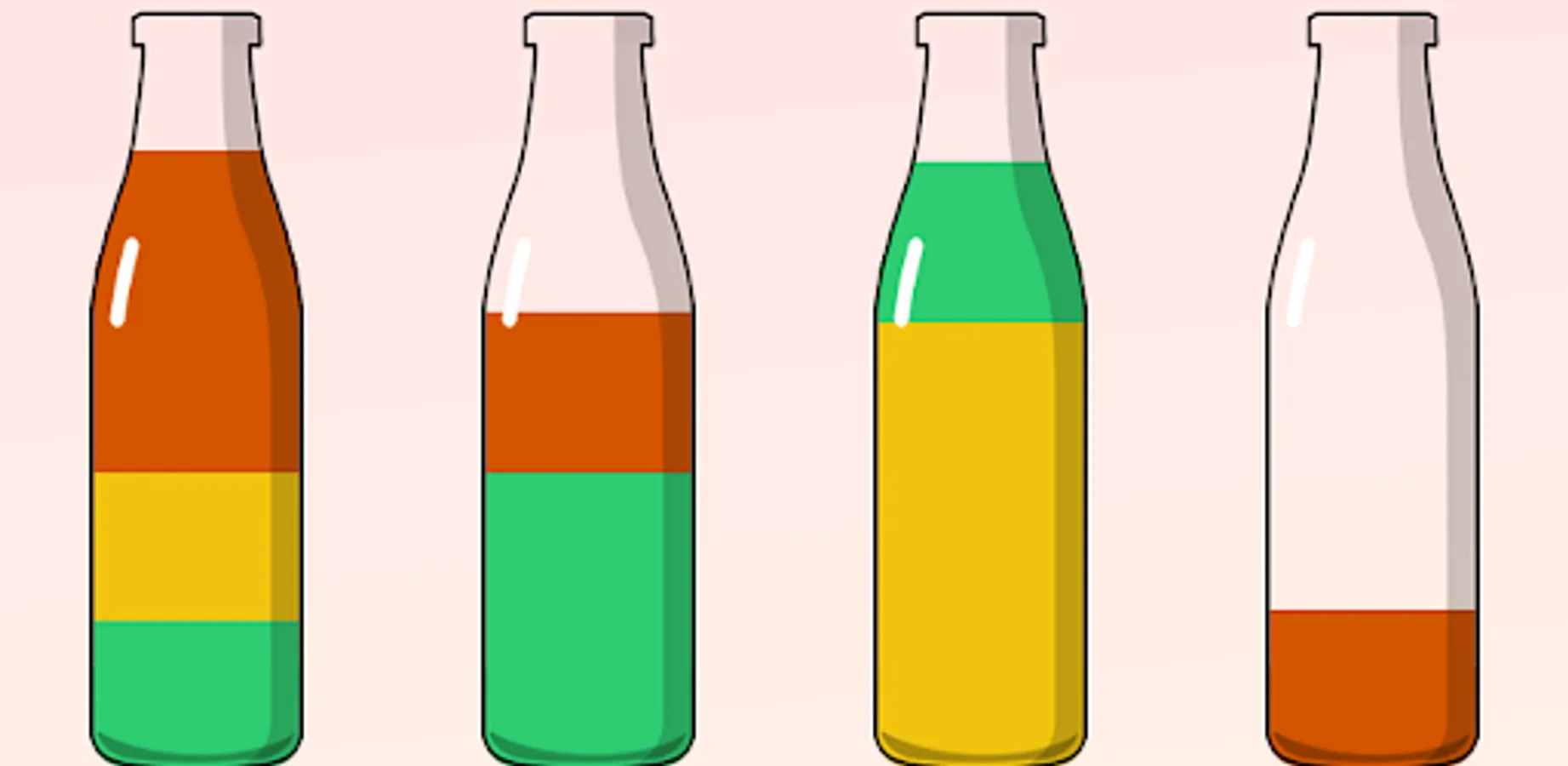Move the water around the different bottles to match the correct colored water in one bottle.