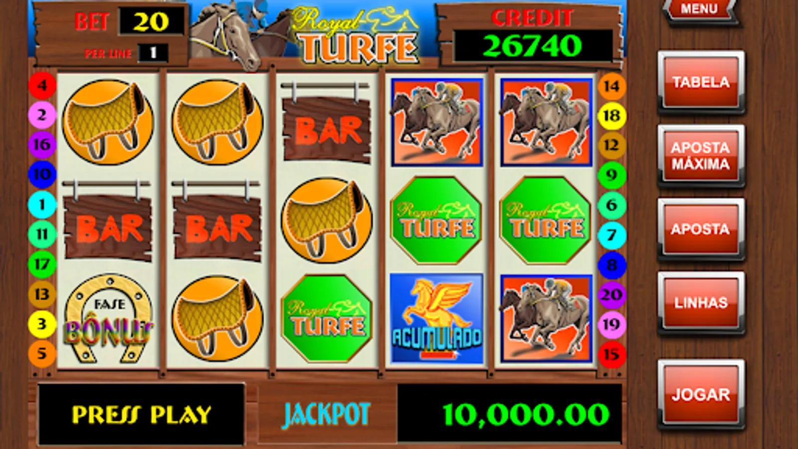 Royal Turf is a slot machine game simulator with 20 lines.