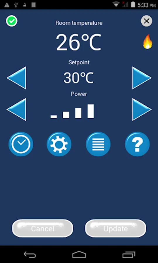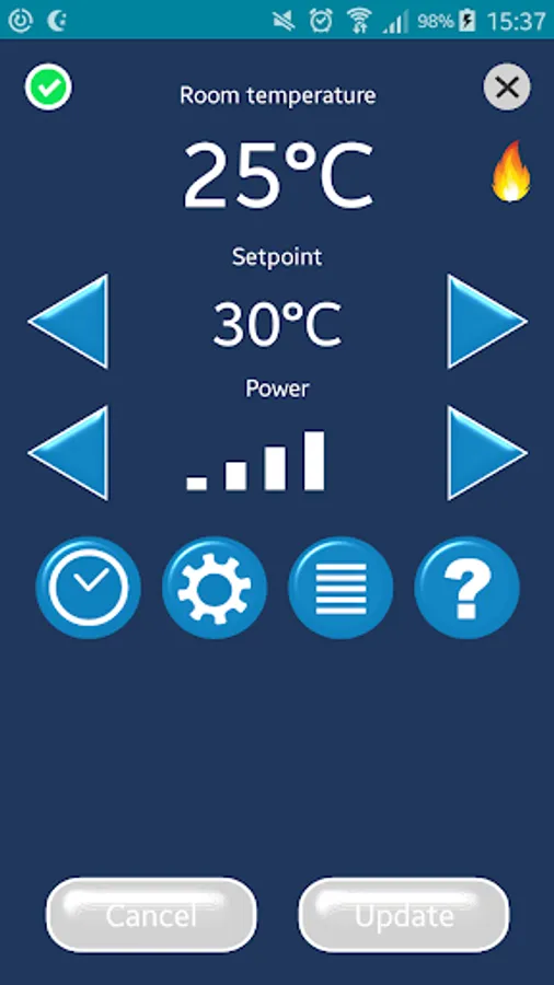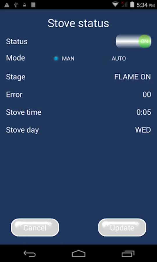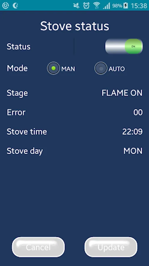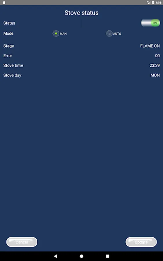 This app allows remote controlling of a pellet stove. It is possible displaying current stove state: room temperature, operating state, anomalies, operation set point and power settings, timer and operation mode.